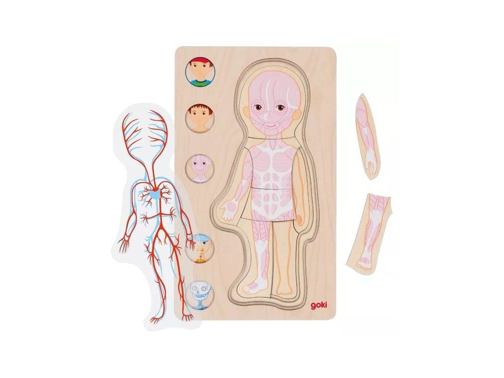 Vrstvené dřevěné puzzle znázorňuje vnitřní stavbu lidského těla formou postupně odkrývaných vrstev. Jednotlivé vrstvy obsahují ilustrace kostry, krevního oběhu, vnitřních orgánů a svalstva.