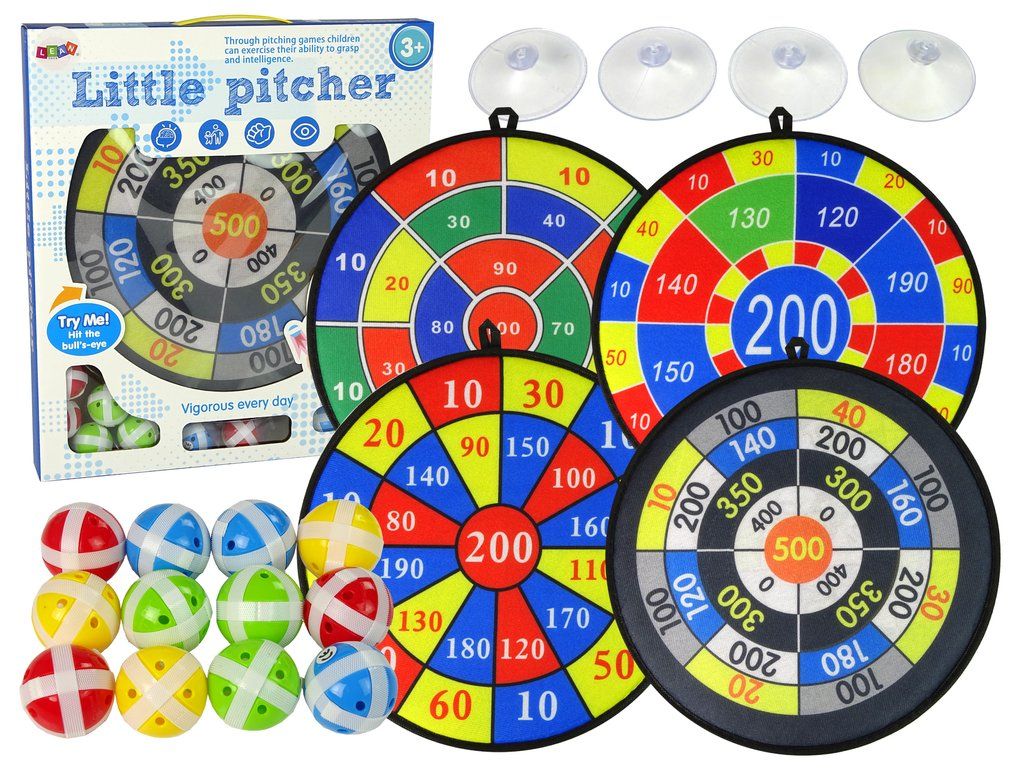 Design terče je klamně podobný jako u dospělých, ale je vyroben z příjemného materiálu na dotek , ke kterému se snadno připojí míčky díky suchému zipu. Dvanáct kulatých míčků rozdělených do čtyř barev vám umožní soutěžit. Shromážděte svou rodinu a začněte hrát.