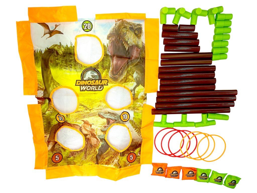 Hra se skládá z pevné, barevné desky ozdobené vyobrazeními různých dinosaurů, což nejen povzbuzuje k zábavě, ale také inspiruje dětskou fantazii. Deska je vybavena bodovacím systémem, který přidává prvek soutěživosti a vzrušení během hry. V sadě také najdete speciálně navržené pytlíky pro házení, které zajišťují stabilitu letu a přesnost zásahů, stejně jako kruhy.