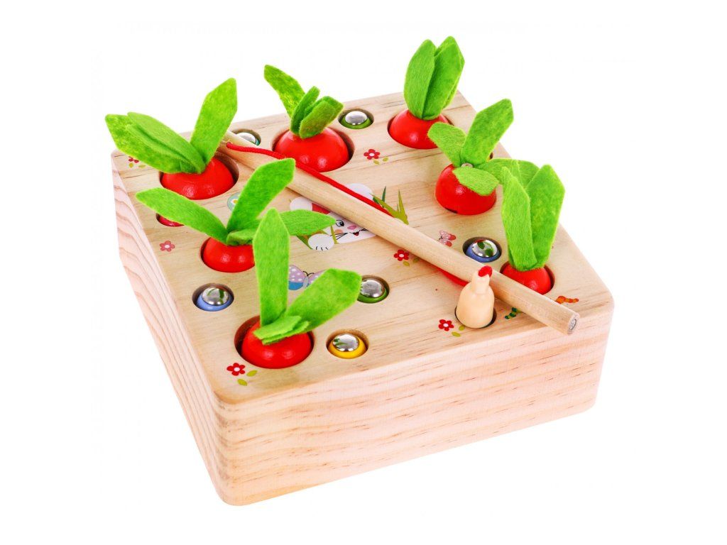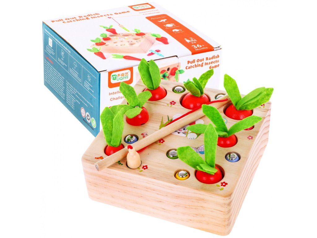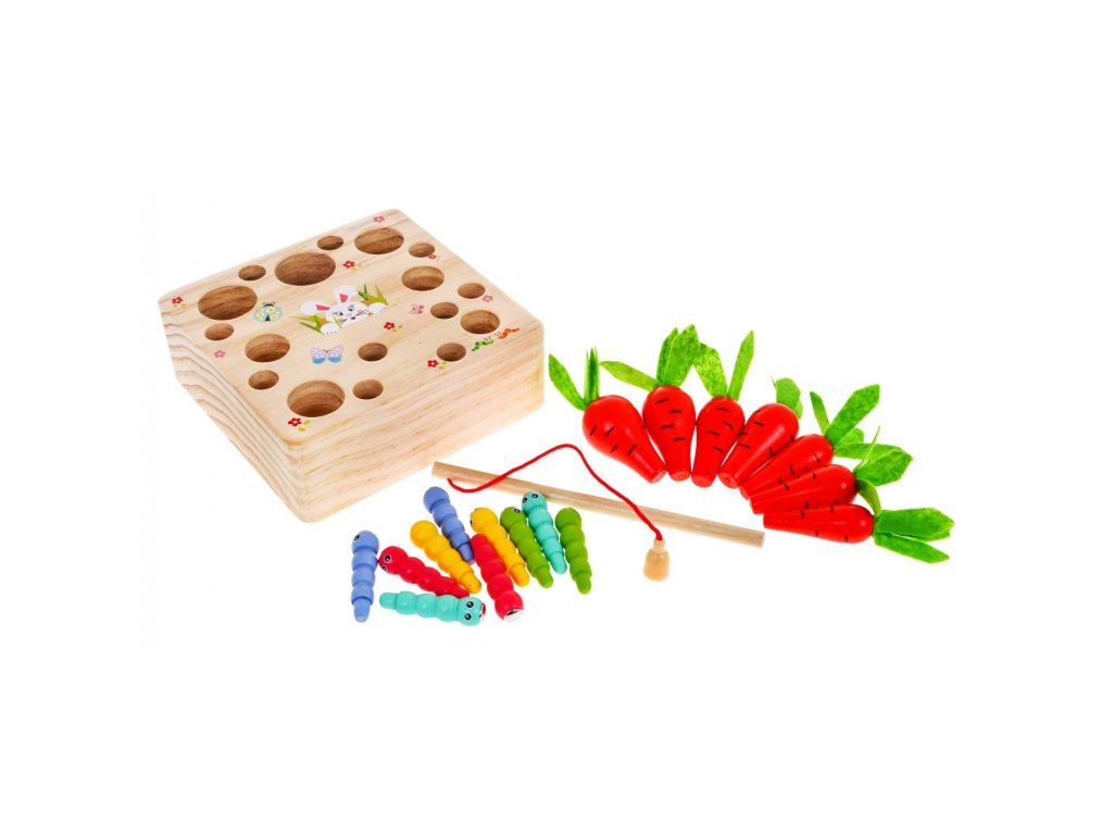 Hračka je určena pro děti od 3 let. Je vyrobena výhradně ze dřeva a natřena bezpečnými, netoxickými barvami, které přitahují dětskou pozornost a podporují hru. Hra podporuje rozvoj intelektu a zručnosti. Dítě musí přiřadit různě velké mrkve a červy k odpovídajícím otvorům. Červi jsou zakončeni magnety a součástí sady je dřevěný rybářský prut rovněž s magnetem. Hru lze hrát samostatně nebo ve skupině. Pomocí rybářského prutu odstraňte všechny červy tak, aby neohrozili rostoucí mrkev, a poté mrkev posbírejte.