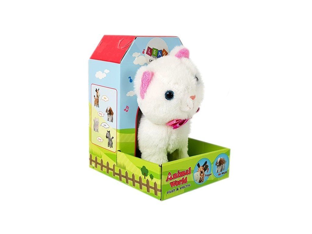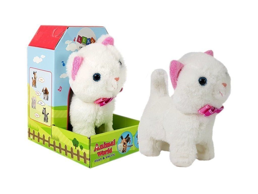 Hračka má zespodu spínač, který umožňuje spustit hračku se zvířátkem. Pokud stisknete tlačítko na pravém uchu, uslyšíte mňoukání a kočička začne chodit dopředu. Pokud tlačítko na uchu podržíte déle, uslyšíte navíc v pozadí hudbu.