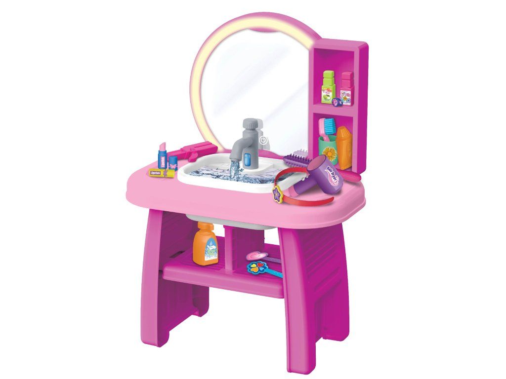 Kosmetický stolek má stabilní konstrukci a prostornou pracovní plochu. Součástí je fén, kartáč, hřeben, rtěnka, parfémy, doplňky a další tematické hračky. Děti mohou napodobovat líčení, česání a každodenní péči – to vše bezpečnou herní formou.