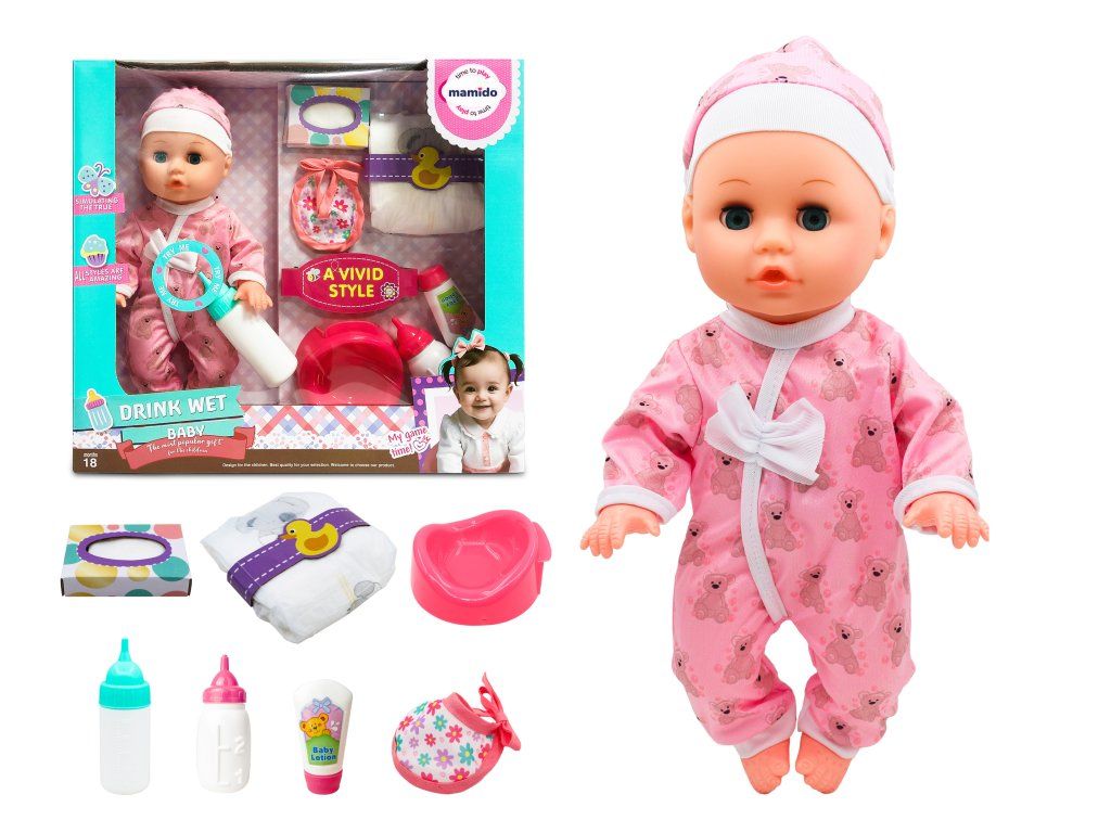Panenka o velikosti 35 cm je oblečená v měkkém růžovém oblečku s čepičkou a disponuje funkčními zvuky aktivovanými stiskem. Po napití z lahvičky může miminko čůrat do přiloženého nočníku, což podporuje realistickou hru, jemnou motoriku i kreativitu. Set obsahuje také plenku, bryndák, lahvičky a box s ubrousky – vše, co malá maminka či tatínek potřebuje.