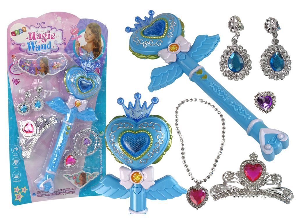 Hůlka má funkci projektoru, která promění místnost v kouzelnou oblohu plnou hvězd, blikající světýlka a pohádkové melodie se rozsvítí po stisknutí tlačítka na přední straně. Součástí kouzelného setu jsou také náušnice, korunka, prsten a náhrdelník s různobarevnými kameny. Celá sada je vedena v pohádkových odstínech.