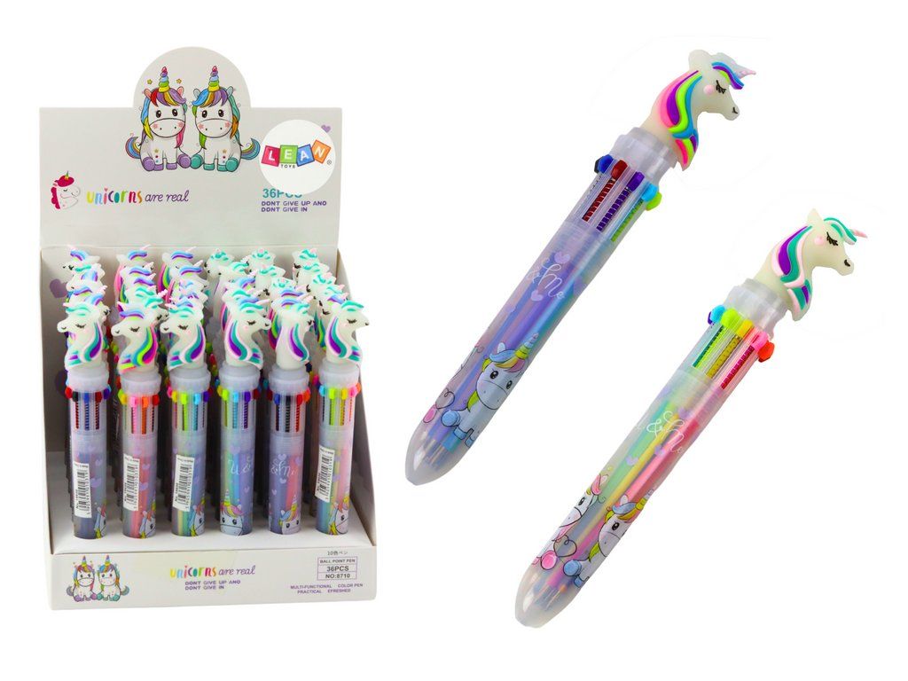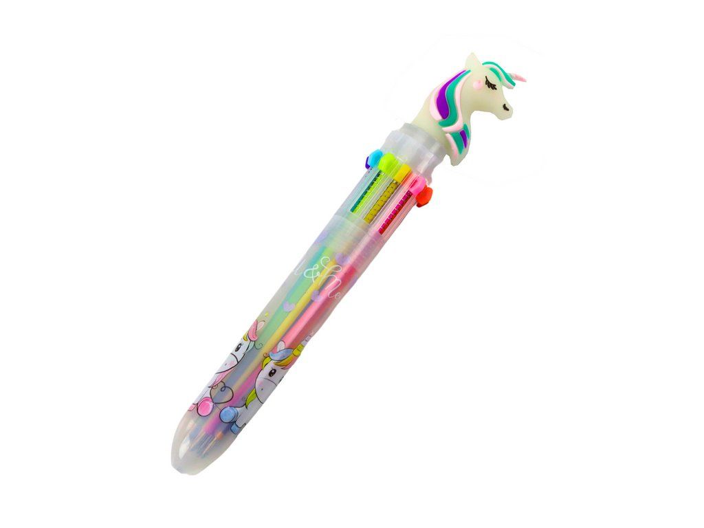 Tato multifunkční propiska s motivem jednorožce kombinuje zábavu s praktičností. Díky snadnému přepínání barev umožňuje rychlé střídání pro kreslení nebo psaní, což dětem usnadňuje a zpříjemňuje práci. Půvabný jednorožec na těle propisky dodává každodenním činnostem kouzlo, a zároveň povzbuzuje zájem o psaní a kreativitu.