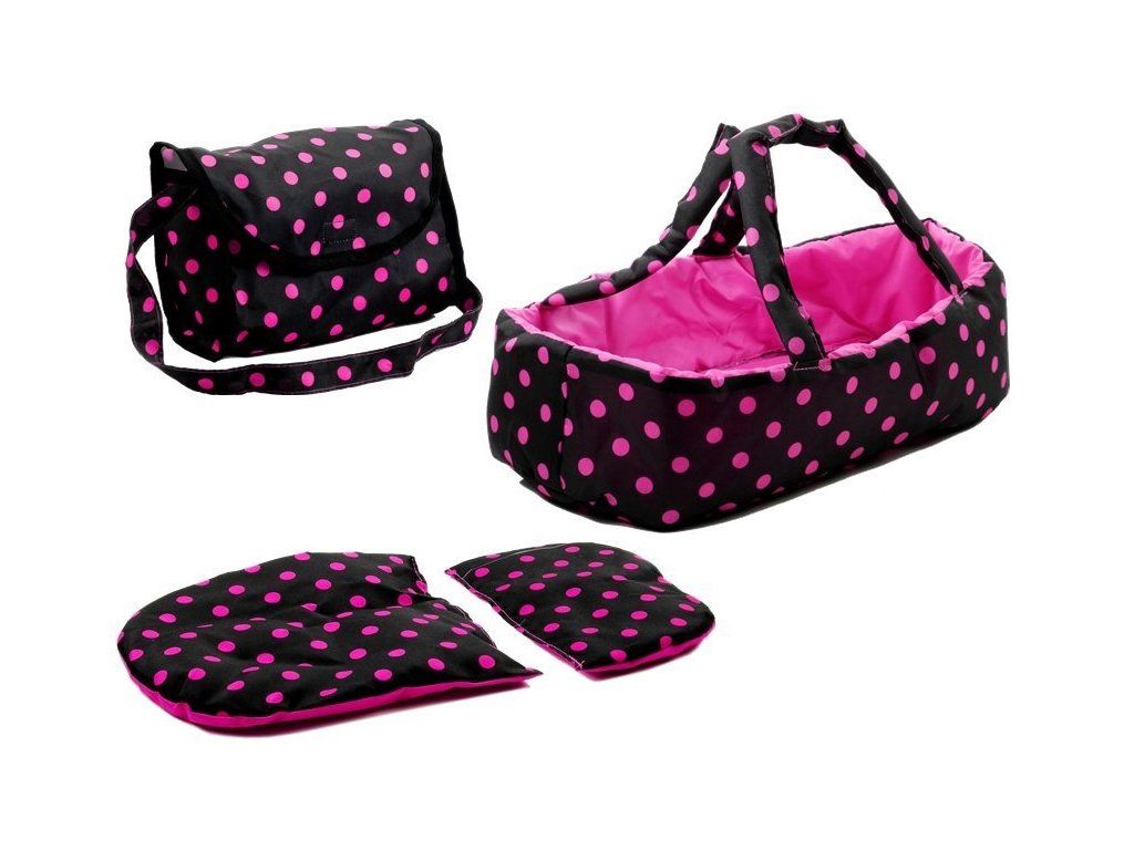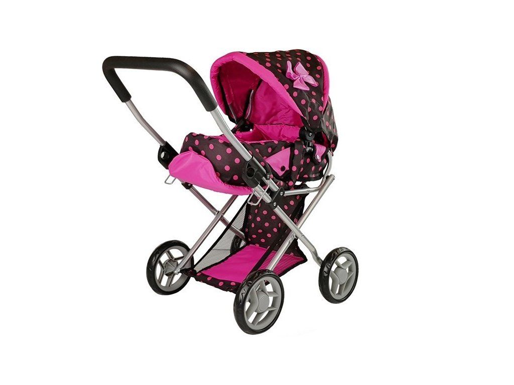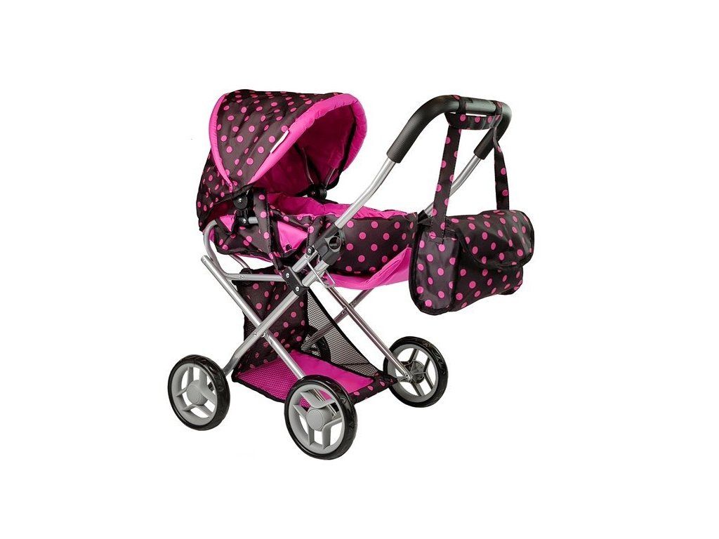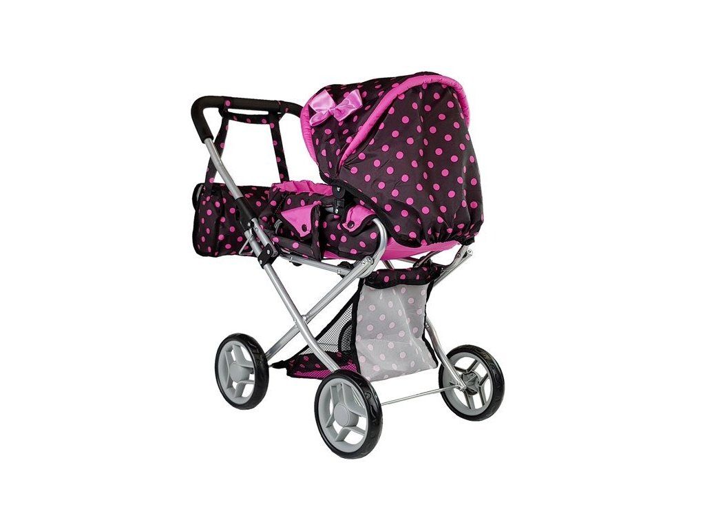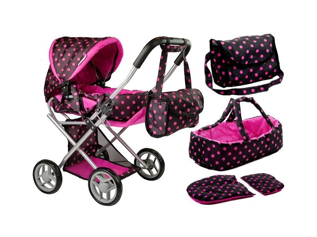 Kočárek pro panenky černý s růžovými puntíky