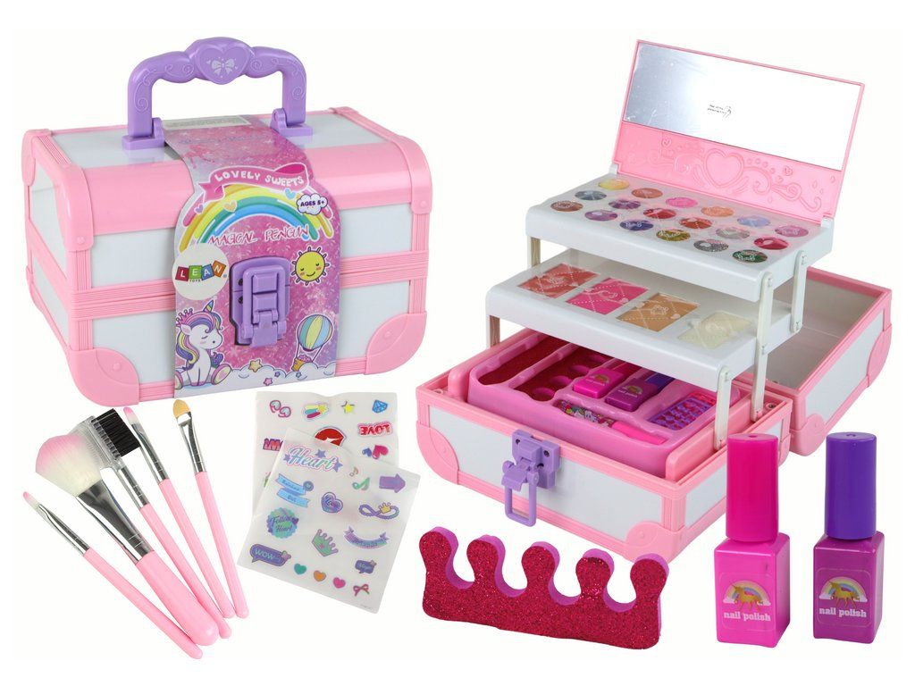 Pro naprosté pohodlí při nanášení make-upu obsahuje sada praktické pomůcky, jako jsou 3 růžové štětce na oční stíny, štětec na make-up a štětec na obočí. Sada obsahuje také nezbytnosti pro manikúru: třpytivý kosmetický separátor a pilník na nehty. 3D nálepky na nehty v pouzdře umožňují jedinečné, personalizované ozdoby.