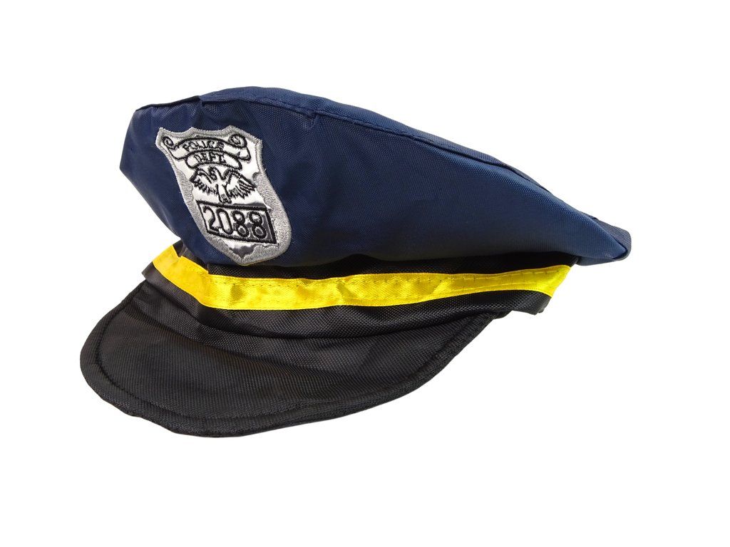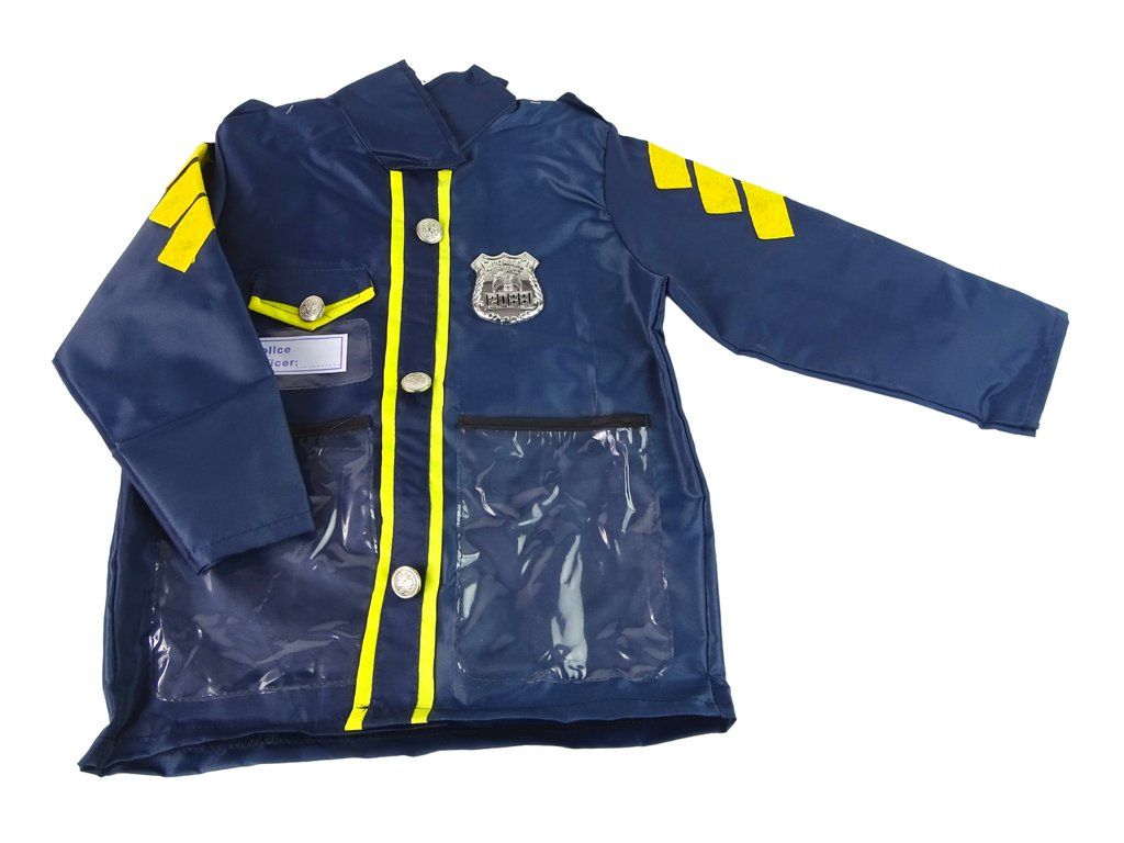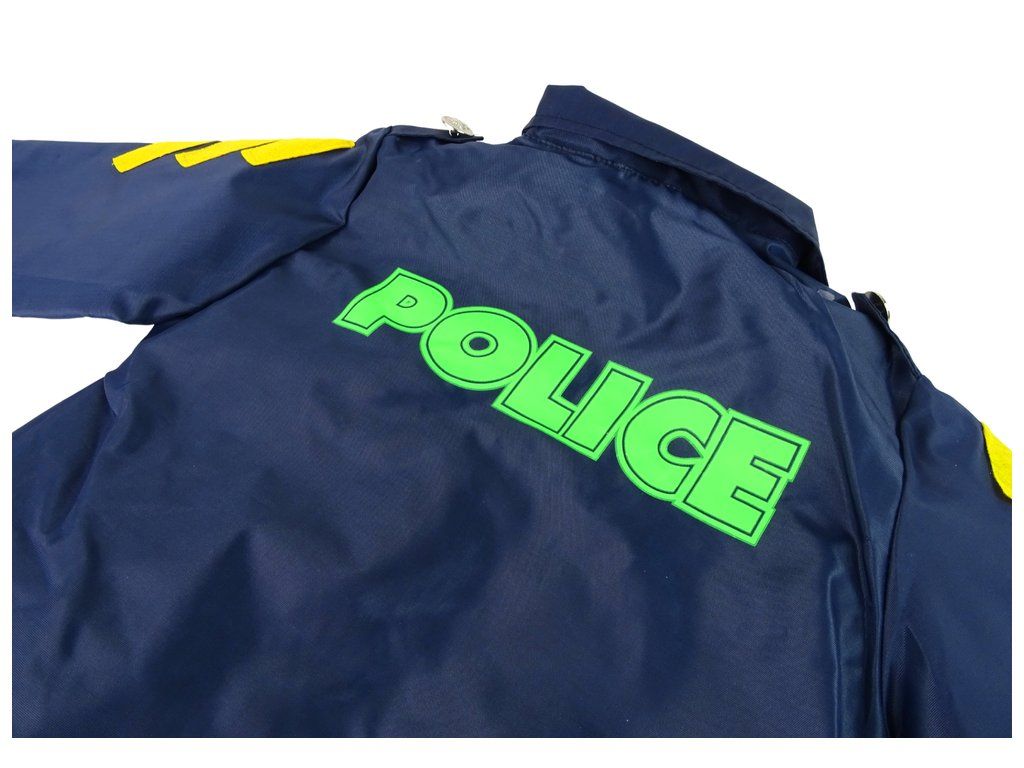 - Policejní uniforma s imitací knoflíků a nápisem POLICE na zádech, která se zapíná na suchý zip