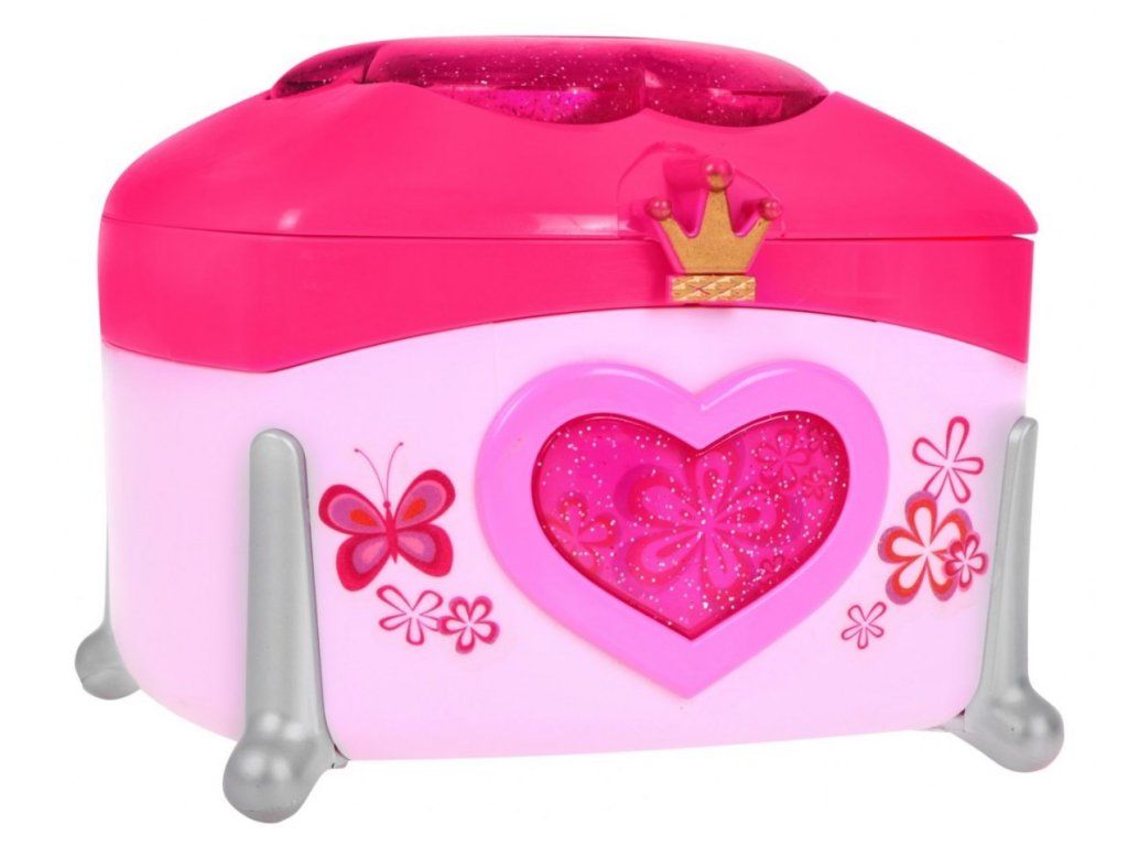 Krásně vyrobený, barevný kufřík s zářícím srdcem. Kufřík lze odemknout a zamknout klíčem, je doprovázený zvuky, které jsou příjemné pro ucho. Vaše dcera se může cítit jako skutečná princezna s kouzlem. Hračka je určená pro děti starší 3 let a má certifikát CE. Hračka poháněná 3 x AA bateriemi (není součástí dodávky).