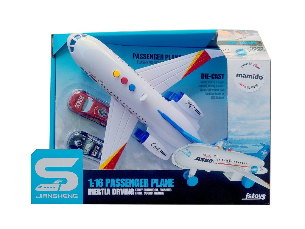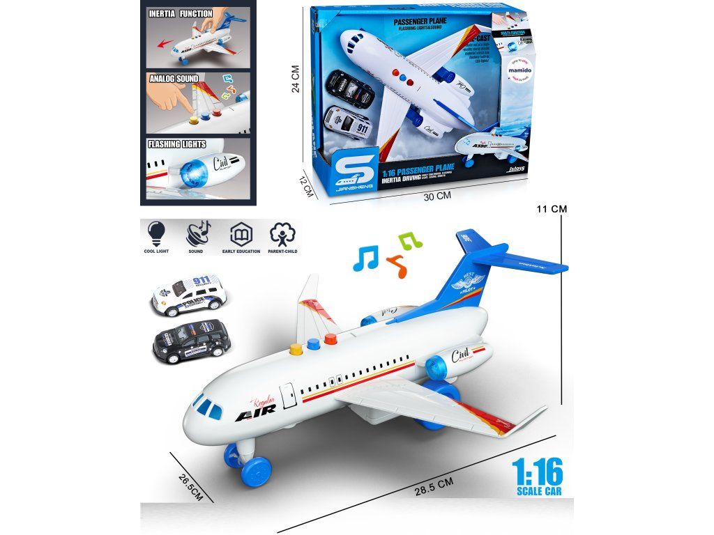 Letadlo 1:16 světelné a zvukové efekty bílé + 2 autíčka MT1288
