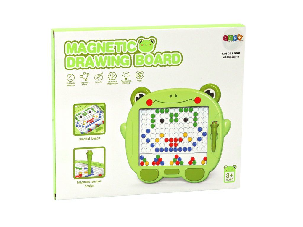 Magnetická tabule ve tvaru roztomilé žabky je ideální hračkou pro rozvoj kreativity a jemné motoriky u dětí. Tabule je vybavena velkou bílou plochou a barevnými magnetickými korálky, které děti mohou uspořádávat pomocí magnetického pera s motivem žabky. Po dokončení obrázku stačí tabulí zatřást, aby se kresba vymazala, a děti tak mohou tvořit stále nové vzory.