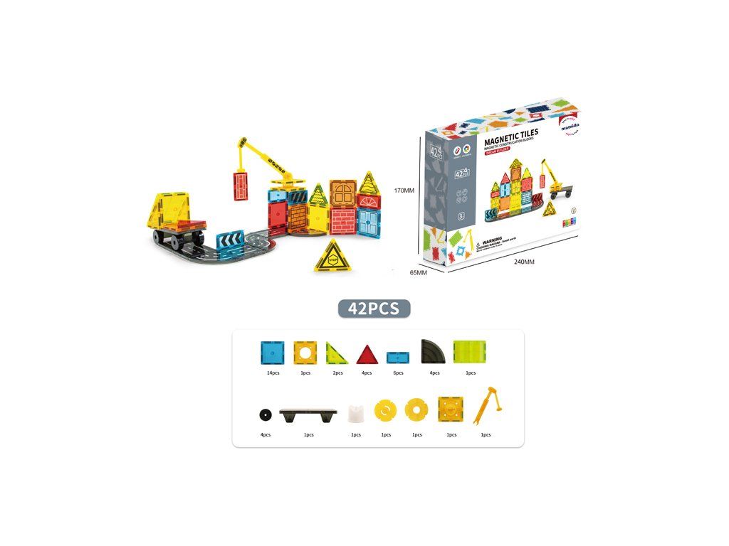 Vydej se do světa dopravy a stavebnictví s originální magnetickou stavebnicí, která se skládá ze 42 dílů. Děti si mohou postavit celé město s cestami, značkami, budovami i vozidly. Barevné magnetické dílky se snadno spojují a umožňují tvořit nekonečné kombinace od jednoduchých staveb až po propracované dopravní scény. Součástí sady jsou také autíčka s podvozkem na kolečkách, dopravní značky, jeřáb a další doplňky, díky nimž hra získává realistický nádech.