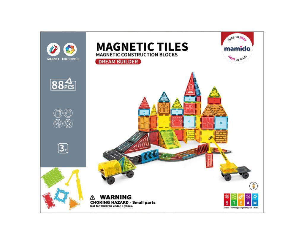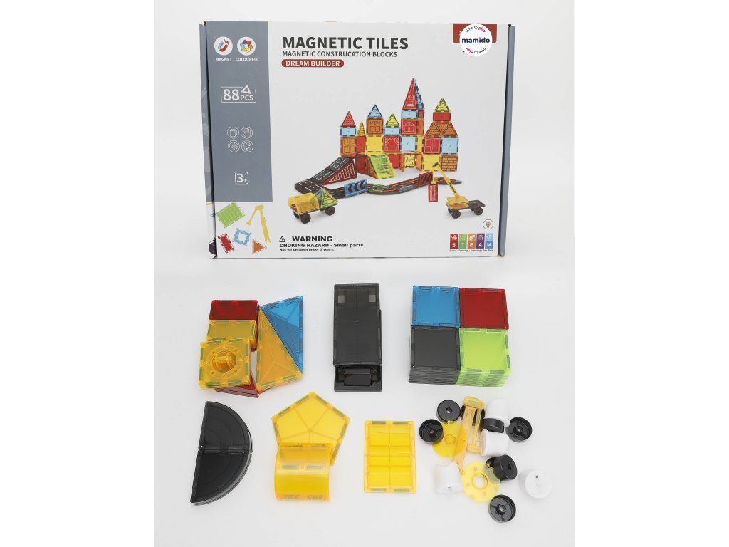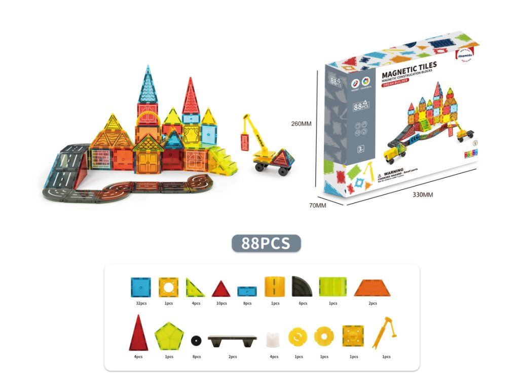 Vydej se do světa dopravy a stavebnictví s originální magnetickou stavebnicí, která se skládá ze 88 dílů. Děti si mohou postavit celé město s cestami, značkami, budovami i vozidly. Barevné magnetické dílky se snadno spojují a umožňují tvořit nekonečné kombinace od jednoduchých staveb až po propracované dopravní scény. Součástí sady jsou také autíčka s podvozkem na kolečkách, dopravní značky, jeřáb a další doplňky, díky nimž hra získává realistický nádech.