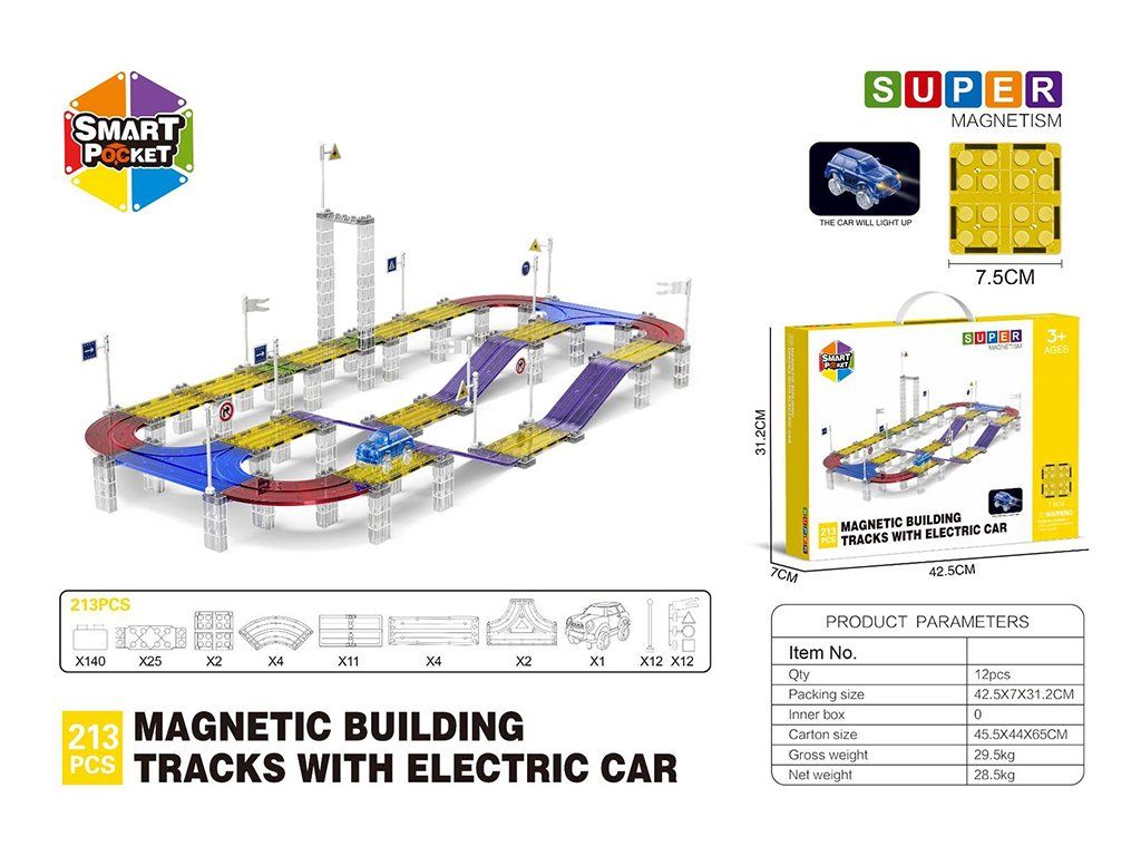Sada obsahuje 213 magnetických dílků včetně speciálních částí pro tvorbu dráhy. Díky silným magnetům se panely jednoduše spojují, takže děti mohou experimentovat s tvary i výškami tratí. Elektrické autíčko samo projíždí celou trasu, což přináší skvělý zážitek z pohybu a rozvíjí technické uvažování.