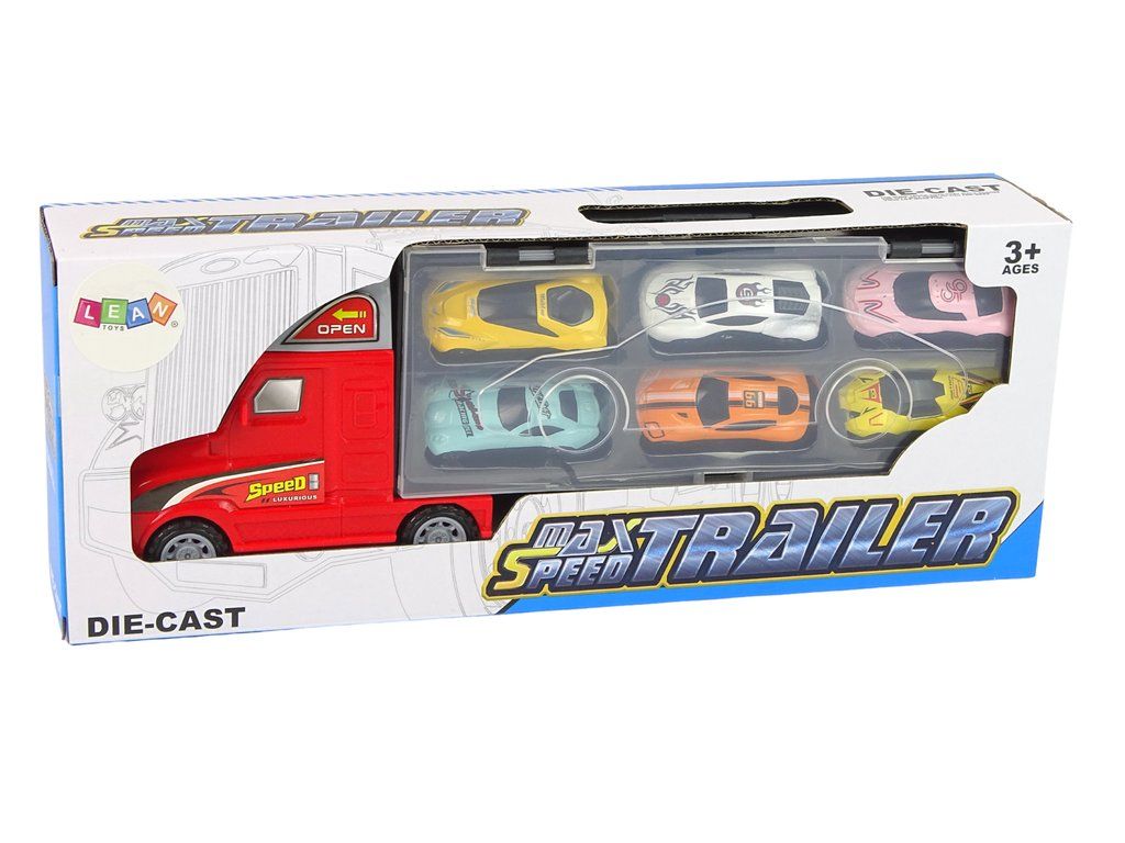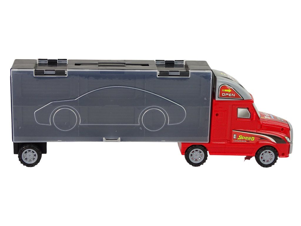 Červený náklaďák s přívěsem, který pojme až 6 autíček. Průhledné boky návěsu se otevírají, aby bylo možné umístit menší autíčka do speciálních přihrádek - boxů - takže je lze přepravovat kamkoli.