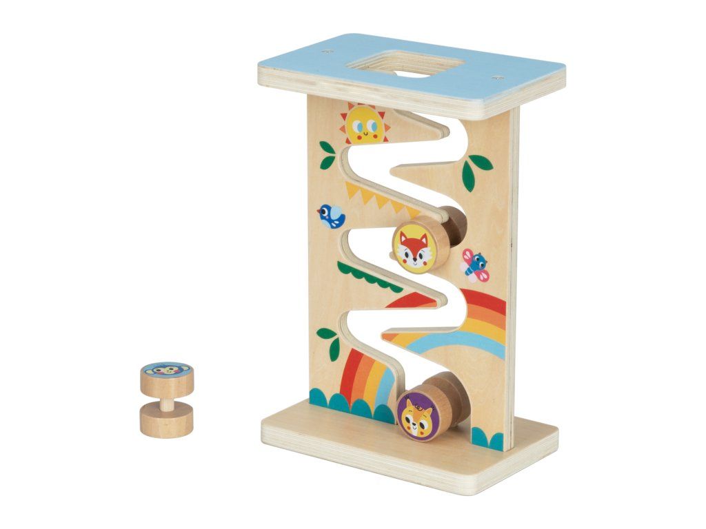- Dřevěná dráha, po které sjíždějí válečky s obrázky zvířátek.