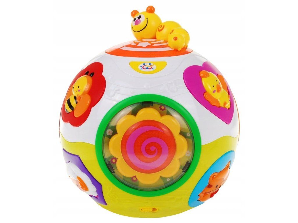 - Rotující koule je doprovázena blikajícími barevnými světly a zábavnými zvuky, které v dítěti vyvolají maximální pozornost.