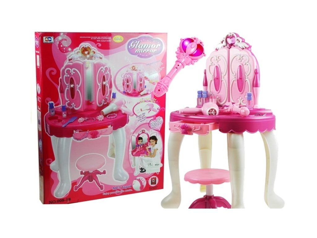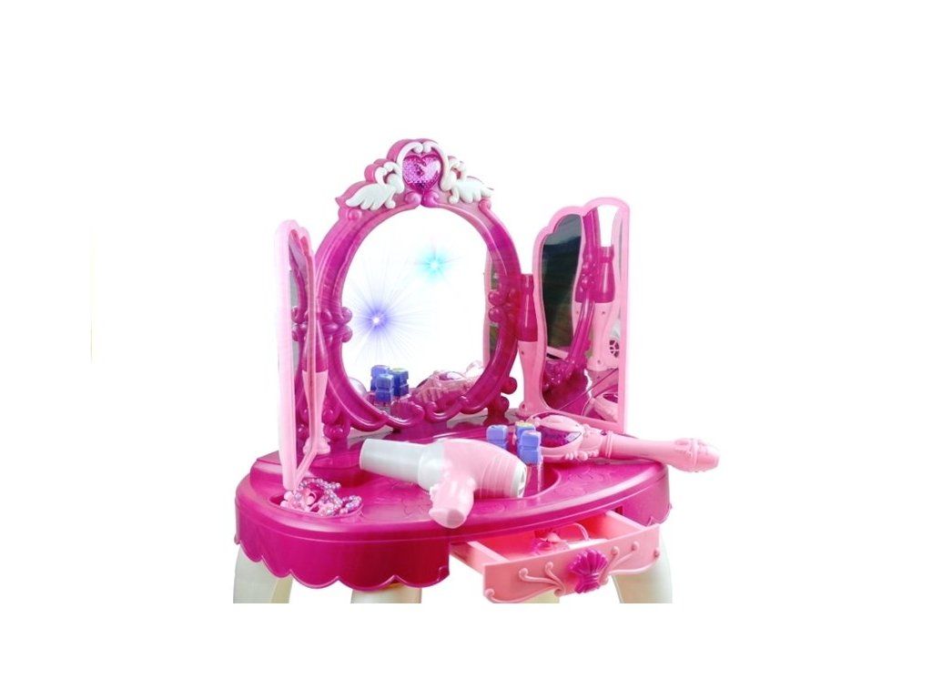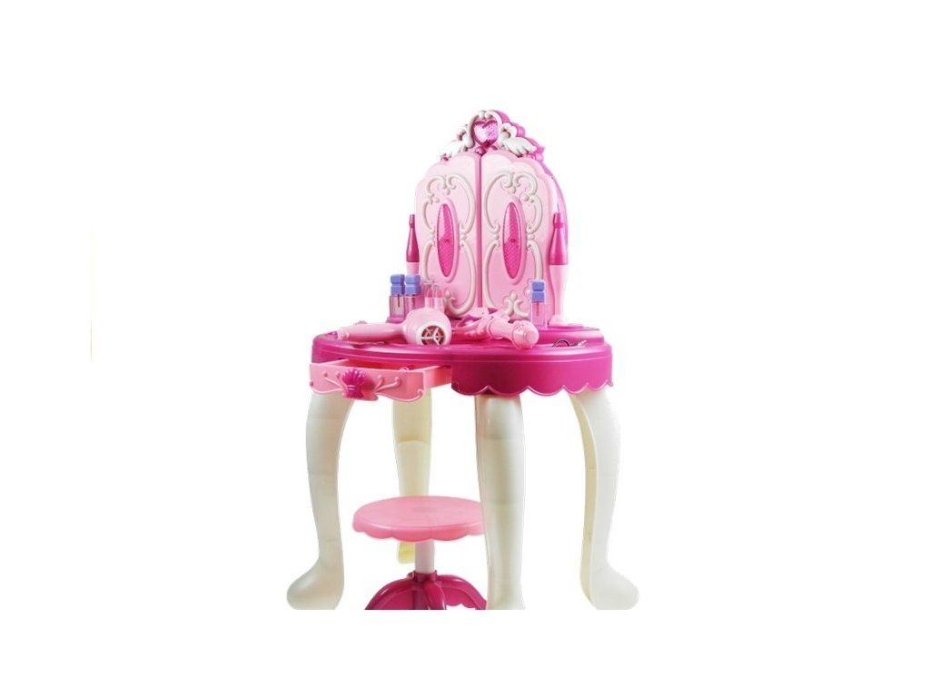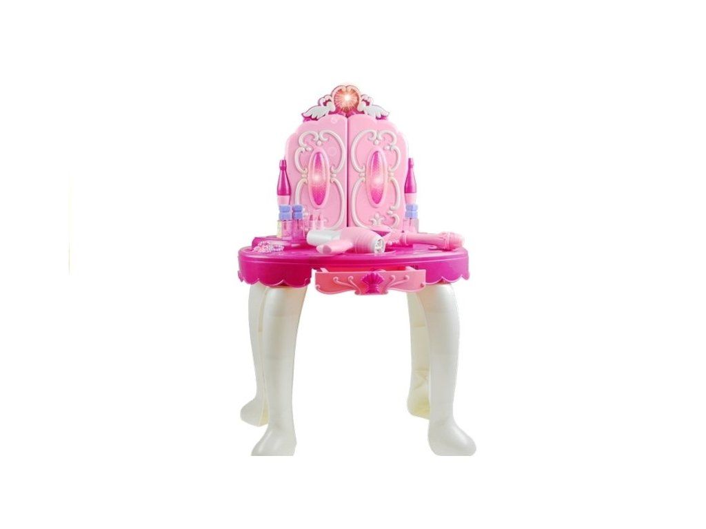 Pro malé holčičky, které milují líčení, je tento princeznovský toaletní stolek ideálním dárkem. Dveře toaletního stolku se otevírají pomocí magické hůlky, stolek je vybaven světly, zvuky a možností připojení k MP3. Skvělý doplněk je také fén na baterie.