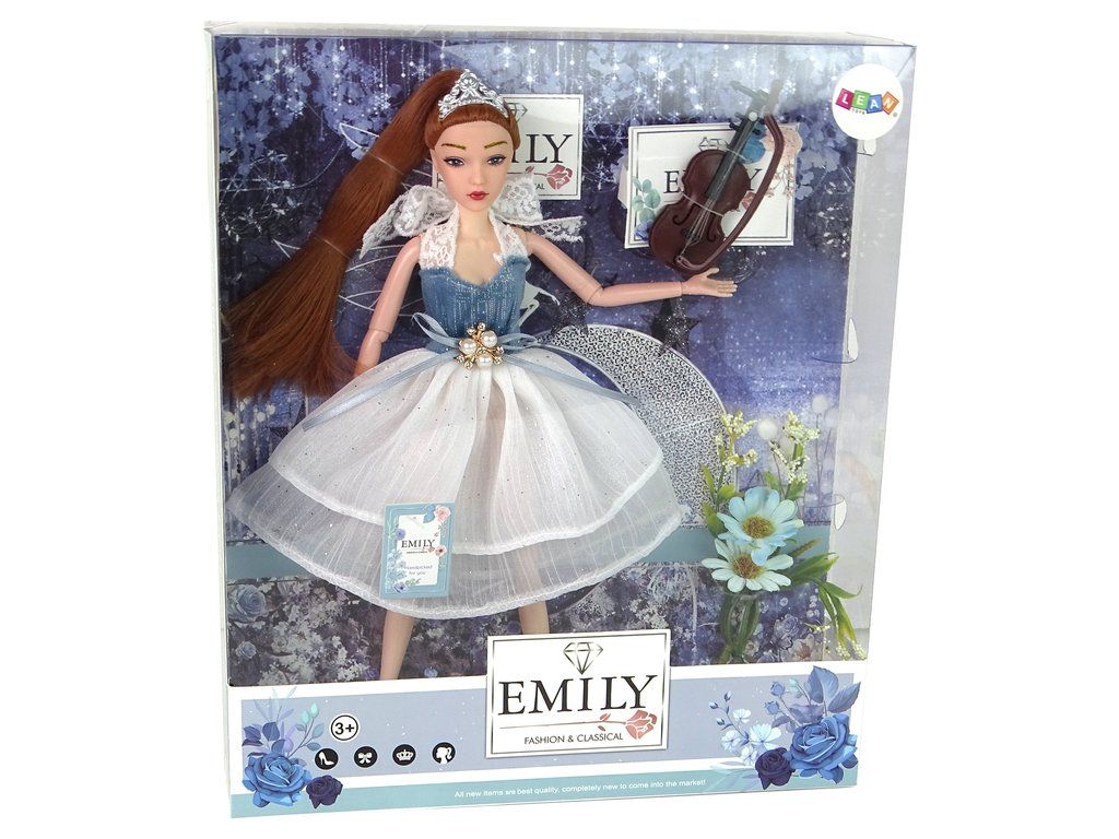 Představujeme půvabnou panenku Emily s dlouhými zrzavými vlasy a modrýma očima, oblečenou do elegantních šatů zdobených třpytkami a mašlí s perličkami. Vlasy má sčesané do culíku a ozdobené diadémem. Emily má na sobě krásné černé vysoké podpatky zdobené růží.