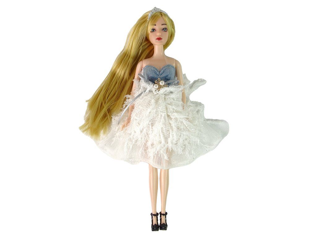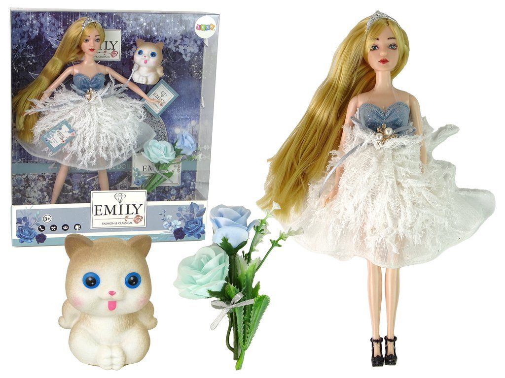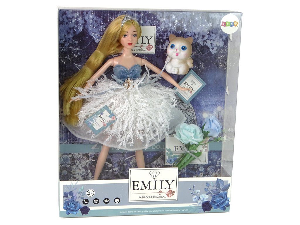 Představujeme vám rozkošnou panenku Emily s dlouhými blonďatými vlasy, oblečenou v elegantní róbě zdobené třpytkami a materiálem připomínajícím peří. Její vlasy zdobí diadém a její modré oči dodávají na šarmu. Emily má na sobě krásné černé vysoké podpatky zdobené růží.