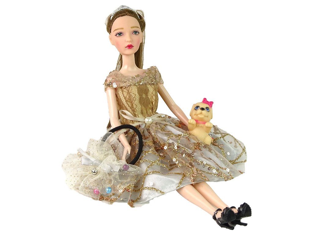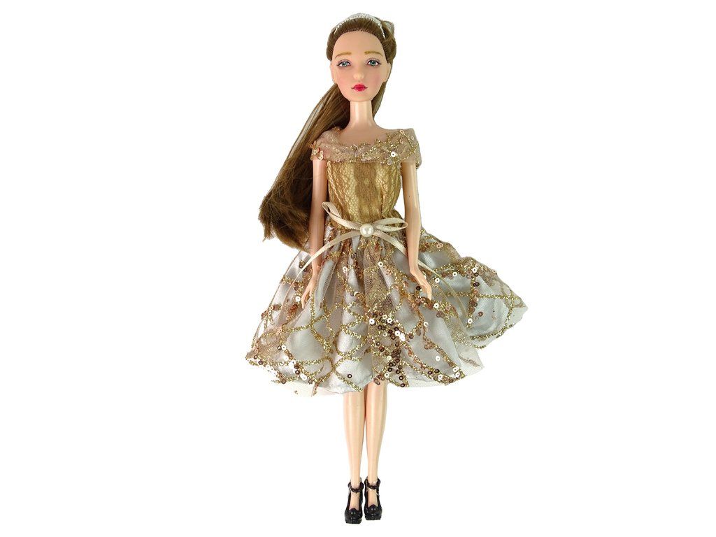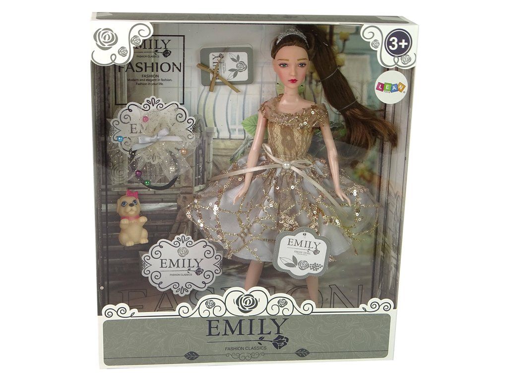 Představujeme rozkošnou panenku Emily s dlouhými tmavými vlasy a modrýma očima, oblečenou do elegantních hnědých šatiček zdobených zlatými flitry a mašlí s perlou. Vlasy má sčesané do culíku a ozdobené diadémem. Emily má na sobě krásné černé vysoké podpatky zdobené růží.