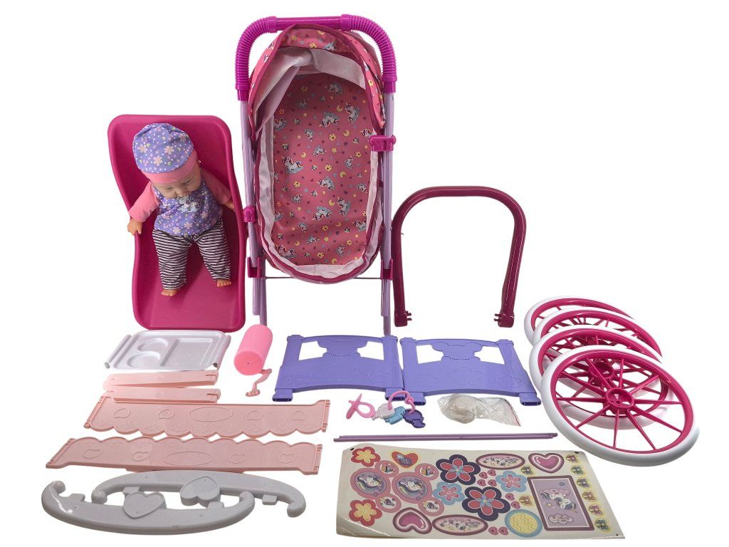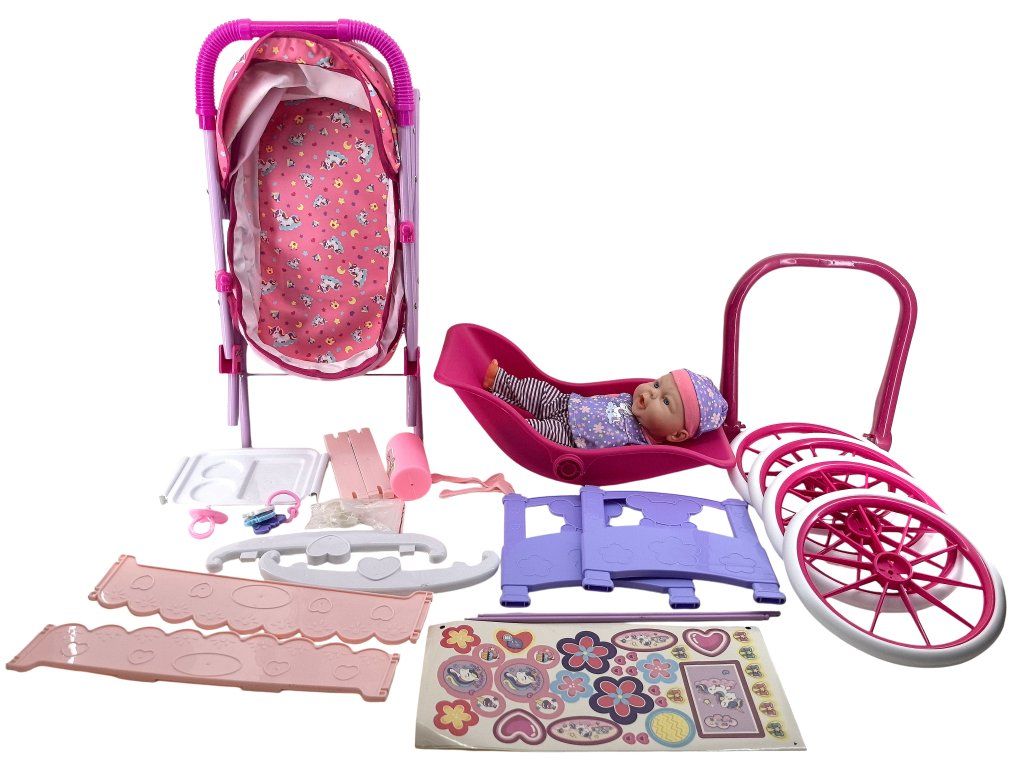 Velký herní set pro malé maminky – obsahuje panenku, díly pro sestavení kočárku, postýlky, autosedačky a další doplňky. Dítě si může sestavit různé varianty péče o miminko, převážet ho, uspávat i nosit. Součástí jsou i samolepky na ozdobení. Hračka je vhodná pro děti od 3 let.