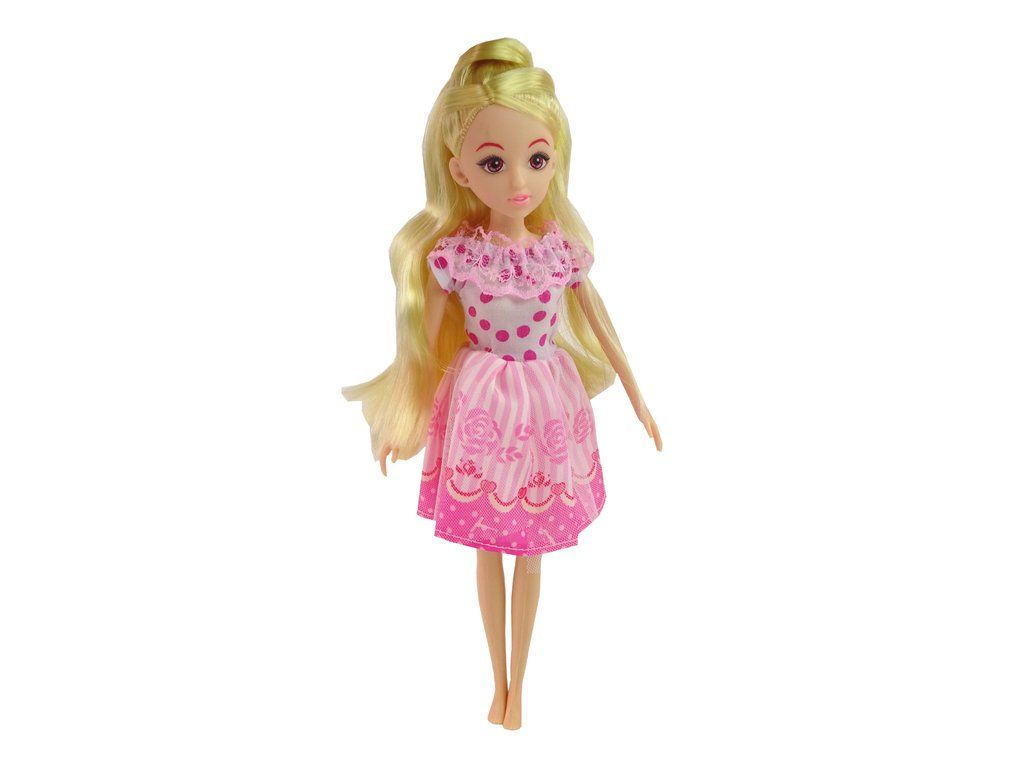 Elegantní panenka dlouhými blond vlasy má na sobě růžové šaty, růžové vysoké boty na podpatku. Souprava je navíc obohacena šperky, které se budou hodit na každou příležitost.