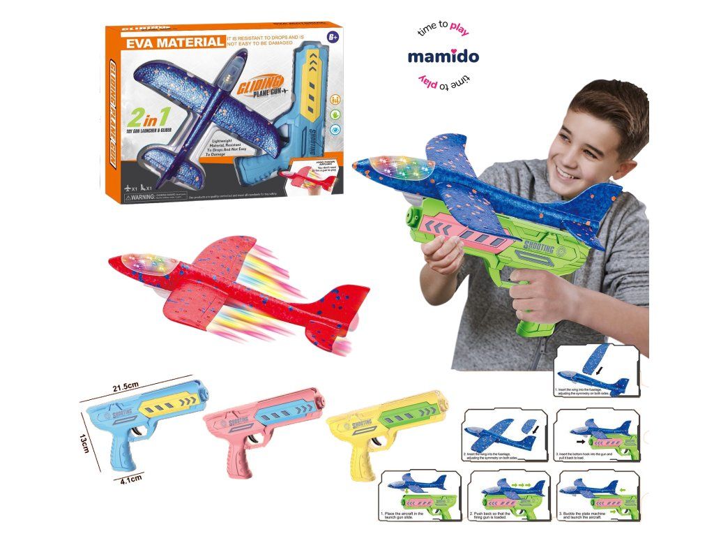 Zažij skvělou zábavu s originální 2v1 pistolí a létajícím kluzákem! Stačí nasadit letadélko z odolné EVA pěny na pistoli, natáhnout a vystřelit – letadlo vzlétne a klouže vzduchem. Díky lehkému materiálu je bezpečné a odolné proti nárazům, takže vydrží i divočejší hru. Některé modely mají navíc i barevné LED světlo, které dodá startu ještě větší efekt.