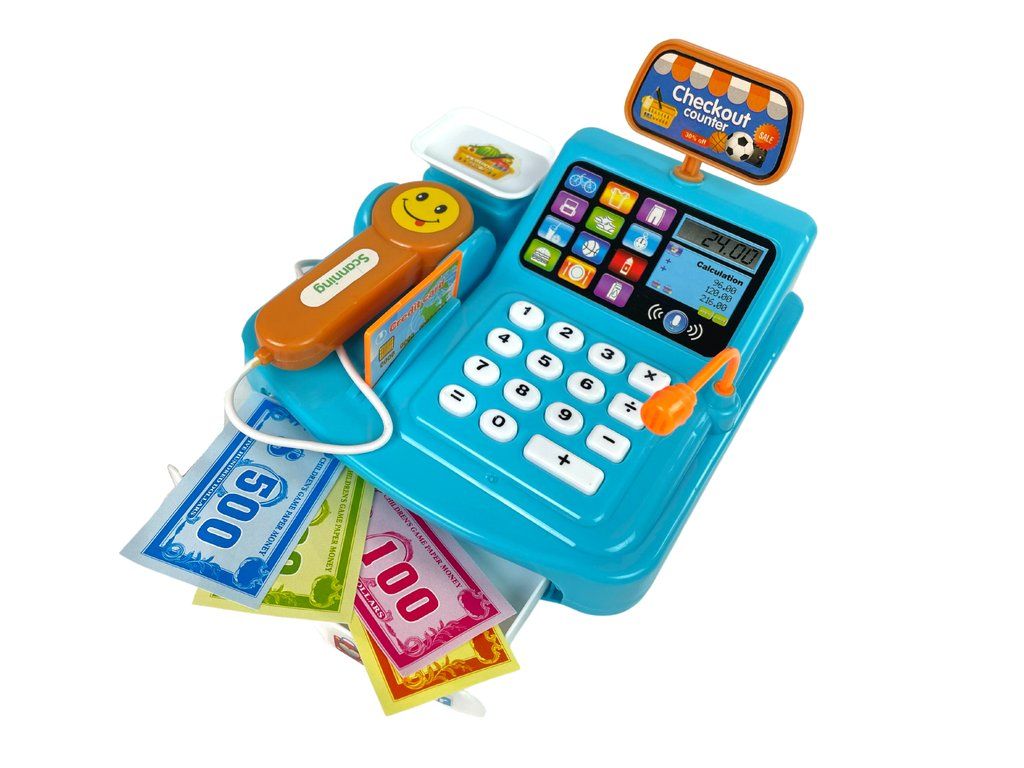 Pokladna je modrá s oranžovými prvky. Mince umožňují zaplatit za potraviny. Skener vydává realistický zvuk, který slyšíme během nákupu v supermarketu.