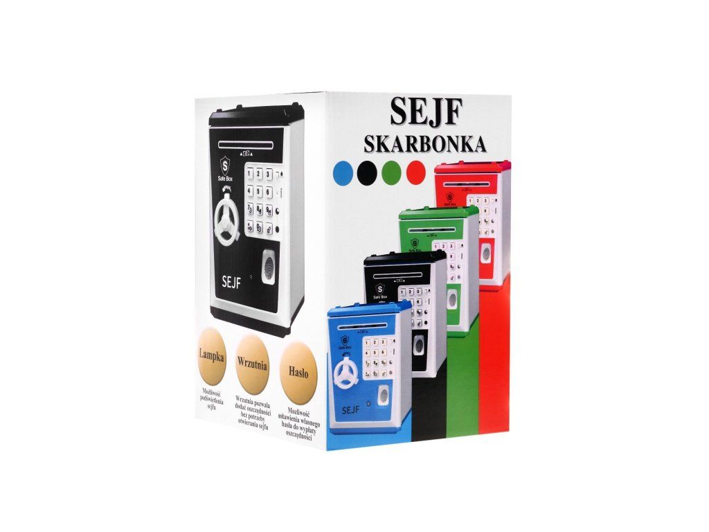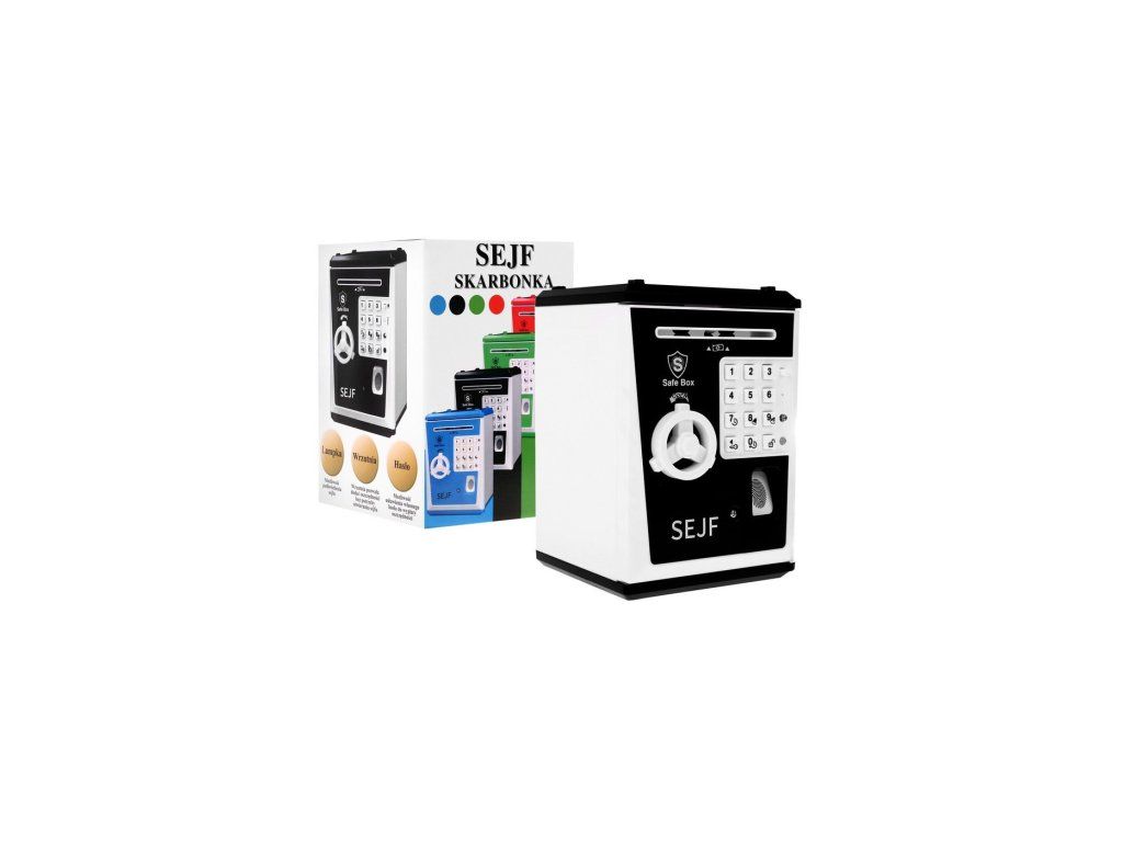 - Pokladnička na peníze ve tvaru trezoru, napájená 3 bateriemi AA 3 x 1,5 V (nejsou součástí balení)
