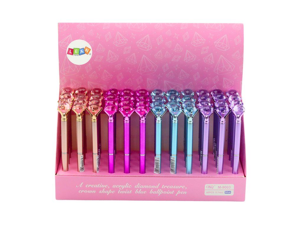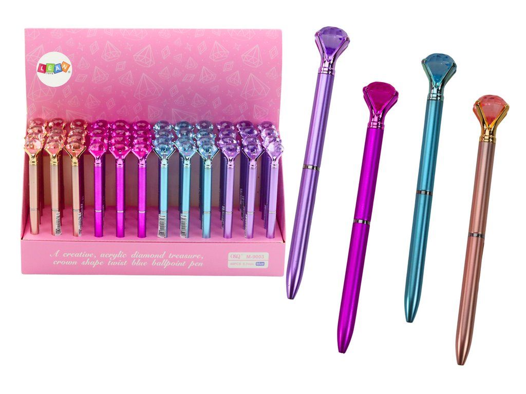 Tato jedinečná propiska spojuje styl a praktičnost, a díky ozdobě ve tvaru diamantu na svém konci působí elegantně a originálně. S modrým inkoustem, který zajišťuje hladké a plynulé psaní, se stává skvělým společníkem pro každodenní poznámky i výjimečné příležitosti. Ideální volba pro ty, kteří chtějí svým písemnostem dodat špetku elegance a osobitosti.