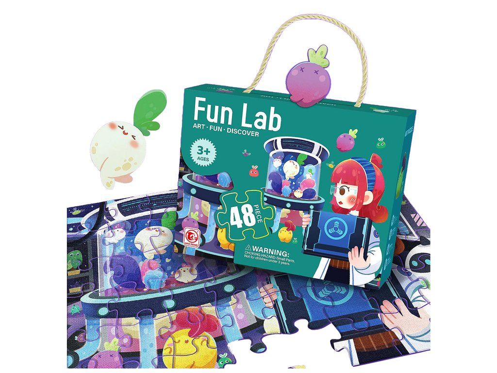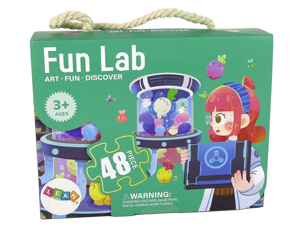 Puzzle je barevné, živé a vybízí ke hře. Obrázek znázorňuje laboratorní dílnu s laboratorními nástroji. Zobrazen je přátelským způsobem, což podpoří hru a učení se názvů zvířat.