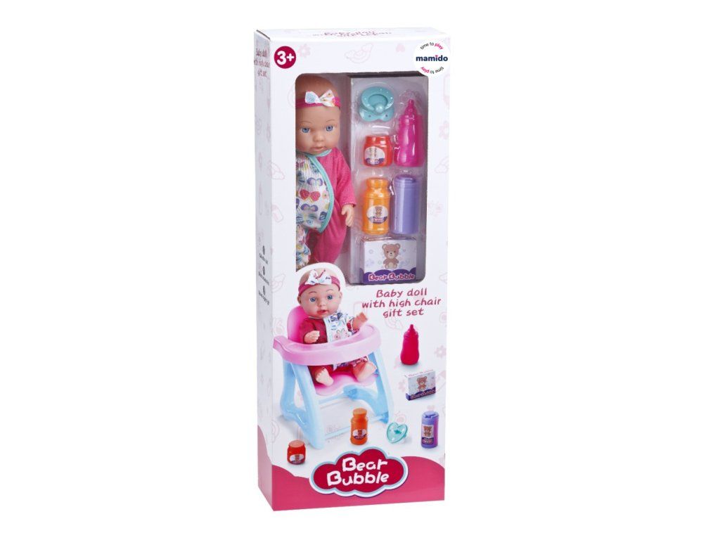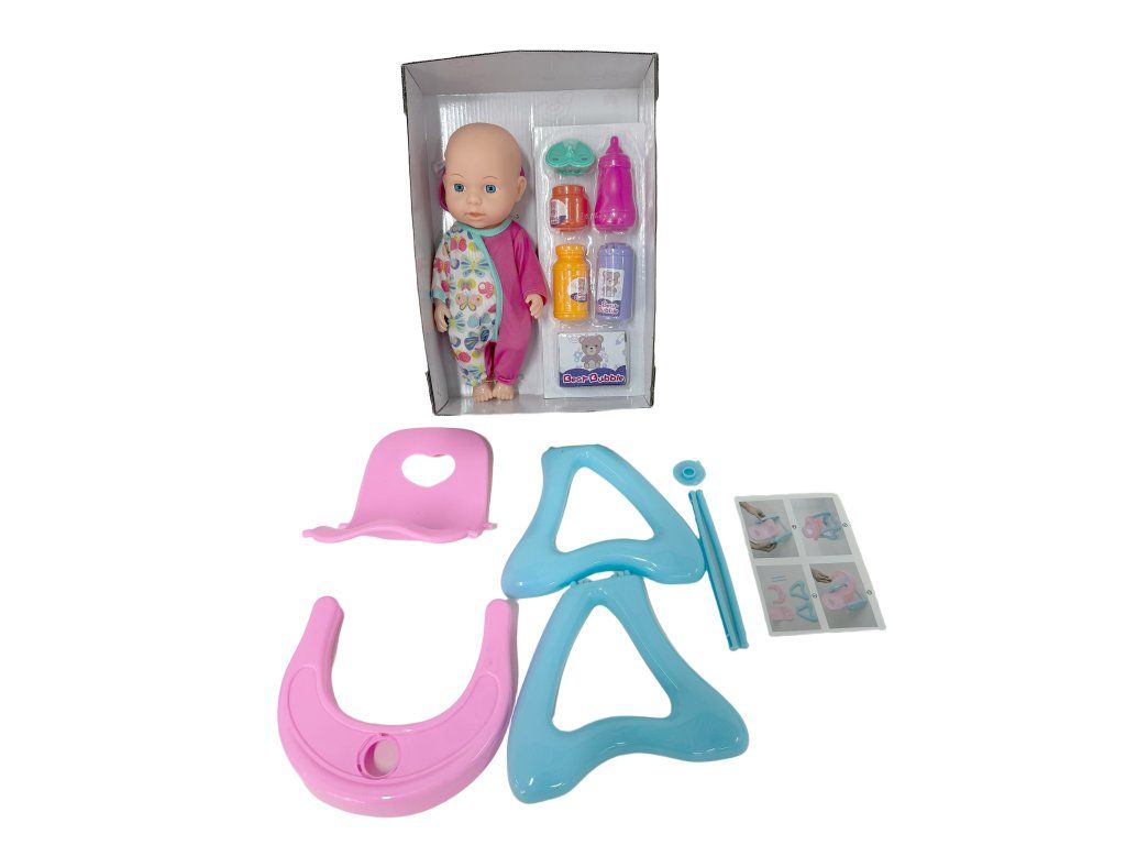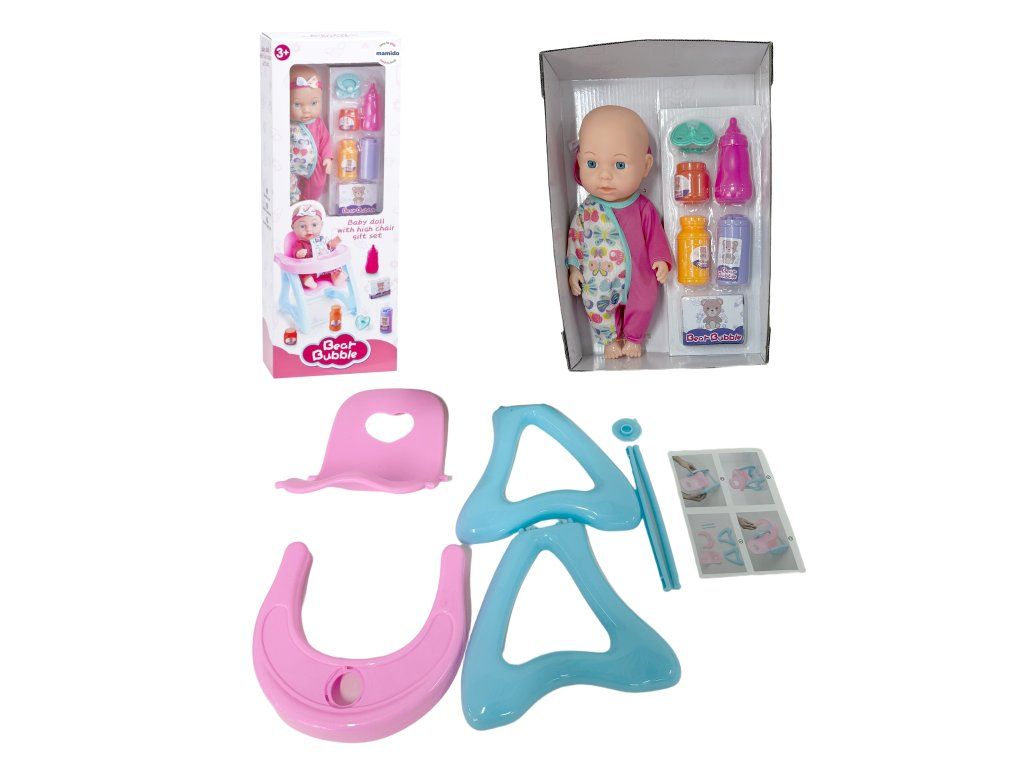 Panenka má jemné rysy, pohyblivé ruce a nohy a je oblečená v barevném overálku. Sestavitelná jídelní židlička z odolných plastových dílů umožní dětem pohodlně „krmit“ své miminko. Set doplňují lahvičky, skleničky s „výživou“, dudlík a další tematické doplňky, které rozšiřují možnosti hry.