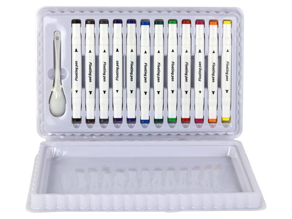 Příprava k malování je snadná a příjemná. Stačí miska s vodou, suchá lžíce a tyto fixy. Nakreslete svůj vzor na suchou lžíci, dotkněte se okraje lžíce vody a sledujte, jak část vzoru vystupuje na hladinu vody. Další efekt můžete dosáhnout hodem lžíce pod úhlem 45 stupňů.