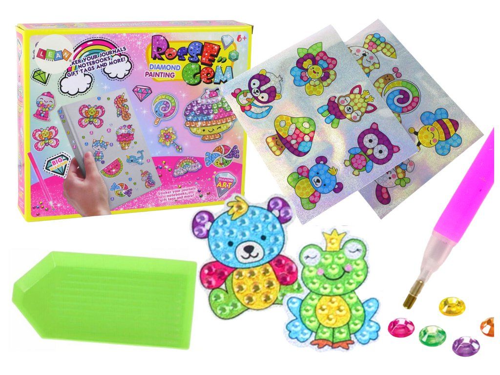 Sada s doplňky pro vytváření jedinečných samolepek je ideální pro malé umělce. Inovativní technika vyšívaní umožňuje vytvářet obrázky nalepením malých diamantů na samolepky s roztomilými zvířecími motivy, které jsou součástí balení.