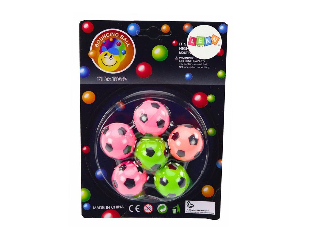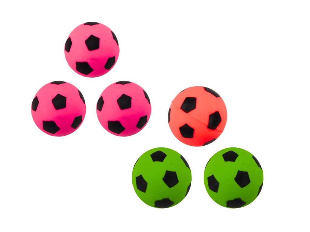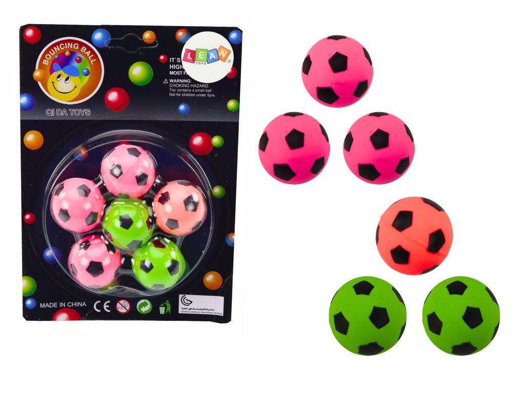 Sada 6 gumových míčků, které okouzlí každého fotbalového nadšence! Tyto jedinečné míčky v růžové, zelené a oranžové barvě připomínají miniaturní fotbalové míče. Jejich vzhled je inspirován tradičními fotbalovými míči, což jim dodává unikátní charakter a činí je ideálními pro hru jak doma, tak i venku.