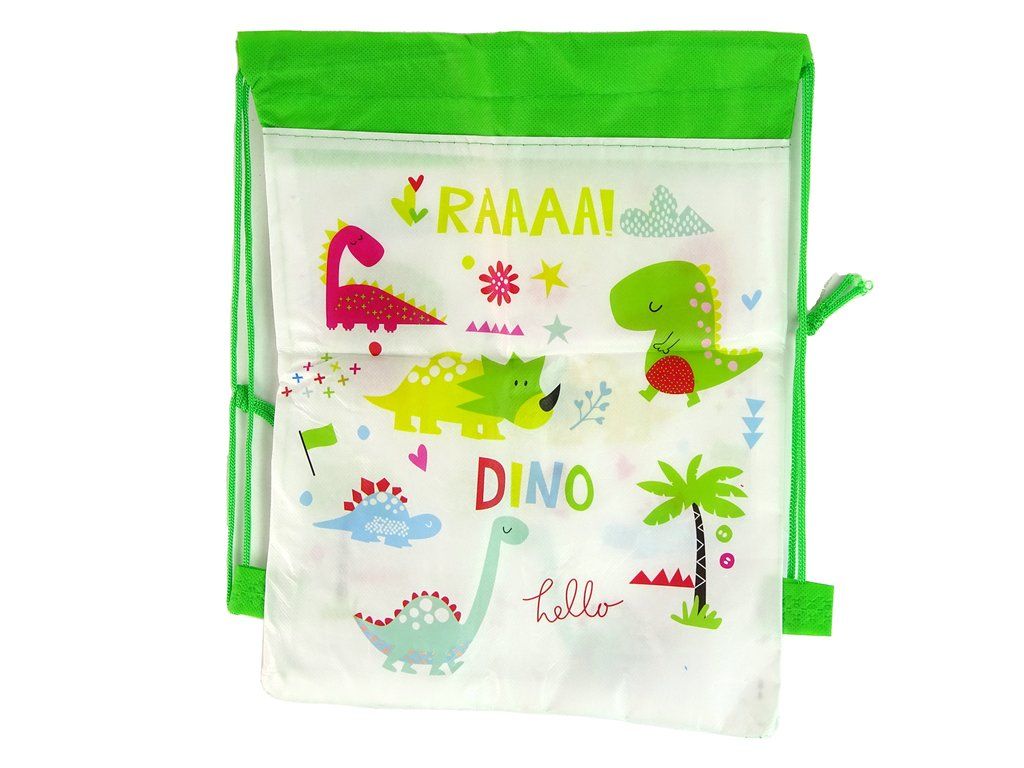 Je zabalen v tašce s motivem dinosaura, kterou můžou děti nosit na zádech a vzít si svou sadu na cesty.