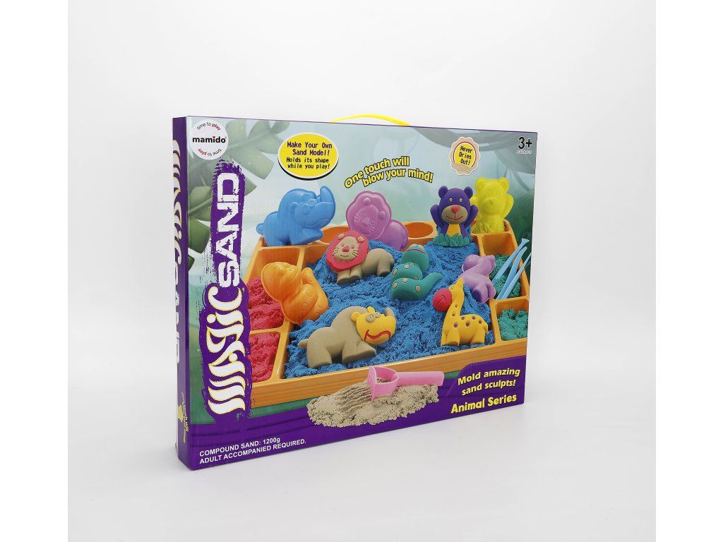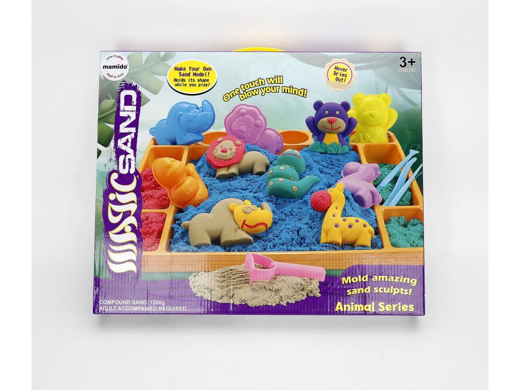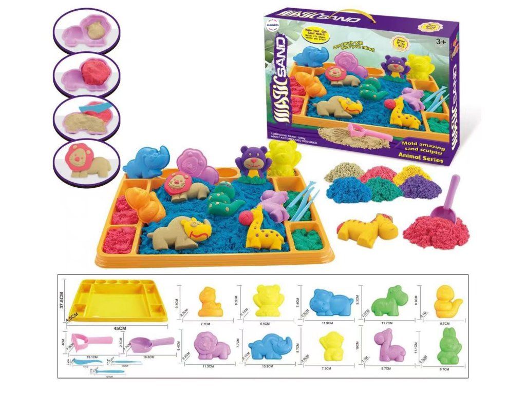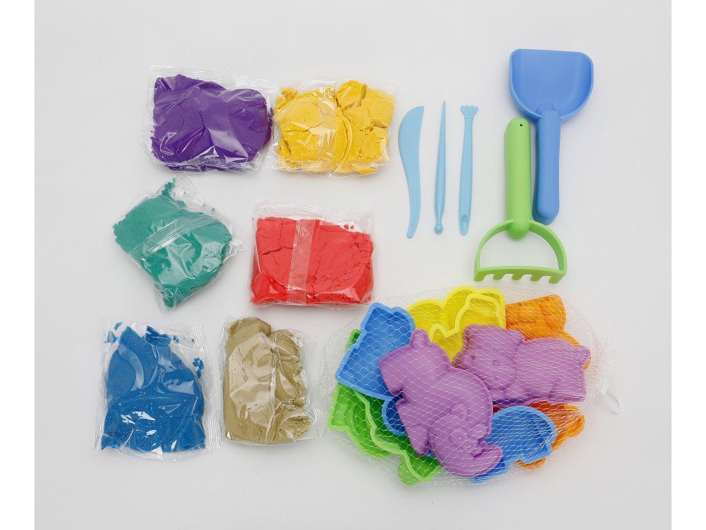 Součástí balení je bohaté příslušenství – barevné formičky ve tvaru zvířátek, lopatky, hrabičky i podložka pro stavění. Díky různým barvám písku mohou děti vytvářet ještě zábavnější a barevnější výtvory. Sada je vhodná na doma i na cesty, protože písek se nerozsypává a snadno se uklízí.