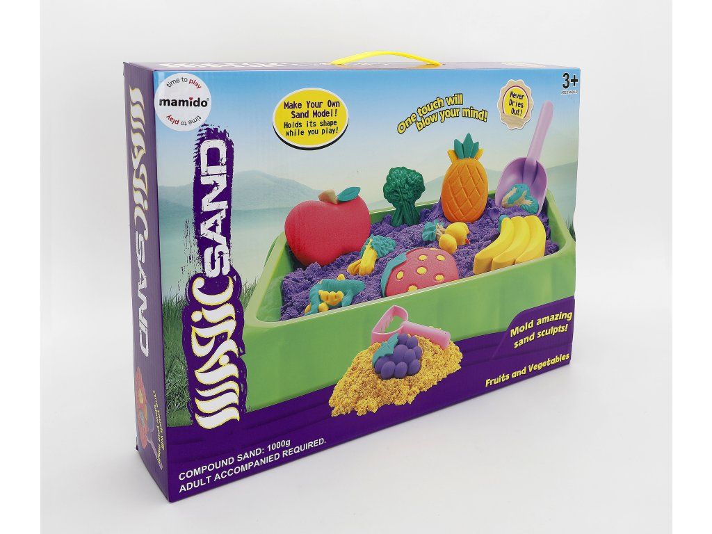 Sada obsahuje různé formičky s motivy ovoce a zeleniny, podložku na hraní a nástroje, díky kterým děti snadno vytvoří barevné postavičky, ovoce či celé scény. Kinetický písek podporuje jemnou motoriku, kreativitu i fantazii a je skvělou alternativou k běžnému modelování.