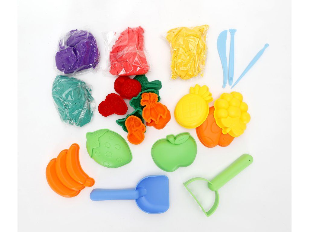 Sada obsahuje různé formičky s motivy ovoce a zeleniny, podložku na hraní a nástroje, díky kterým děti snadno vytvoří barevné postavičky, ovoce či celé scény. Kinetický písek podporuje jemnou motoriku, kreativitu i fantazii a je skvělou alternativou k běžnému modelování.