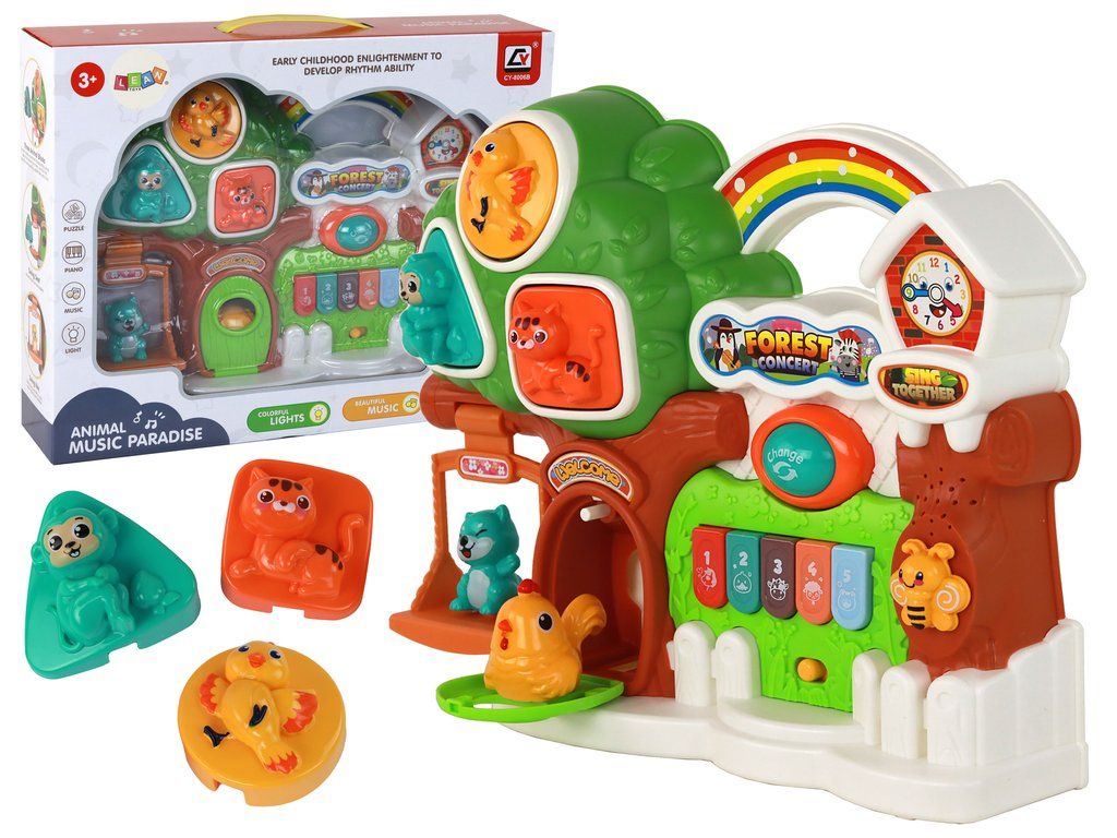 Piano má tvar roztomilého lesa, což ihned přitahuje pozornost dítěte. Celá konstrukce je navržena tak, aby podněcovala batolata k objevování různých prvků. Dřevěný stromek má funkci nejen dekorativní, ale také poskytuje interaktivní prostředí. Na jeho větvích je zavěšena houpačka, na které se může houpat roztomilý ptáček nebo medvěd, kteří jsou součástí sady.
