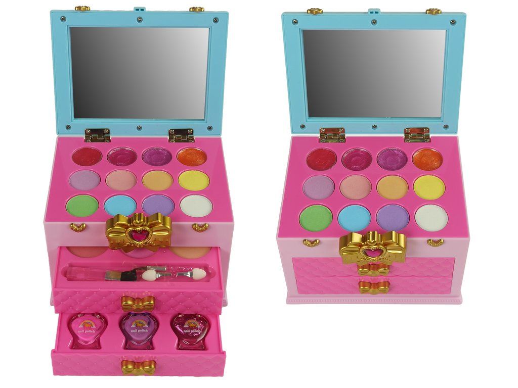 Celá sada je uložena v krásném kufříku uzavřeném sponou s mašlí a diamantovým srdíčkem. Samotný kufřík je velmi elegantně a zajímavě proveden. Růžové a světle modré barevné provedení se hodí do každého interiéru, zejména do dětského pokoje. Zásuvky jsou výsuvné a mají úchytku ve tvaru zlaté mašle. Po otevření pouzdra bude holčička nadšená z výběru barev očních stínů a lesku na rty. Na víku je zrcátko, takže si kazetu bude moci snadno vzít s sebou a kdekoli se namalovat.
