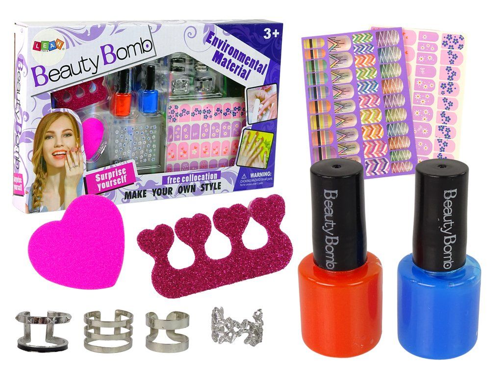 Vícebarevná sada laků na nehty a různé barevné samolepky. Klasické, vzorované a třpytivé samolepky vám umožní vytvořit krásnou manikúru, kterou lze rychle a neinvazivně odstranit běžným odlakovačem.