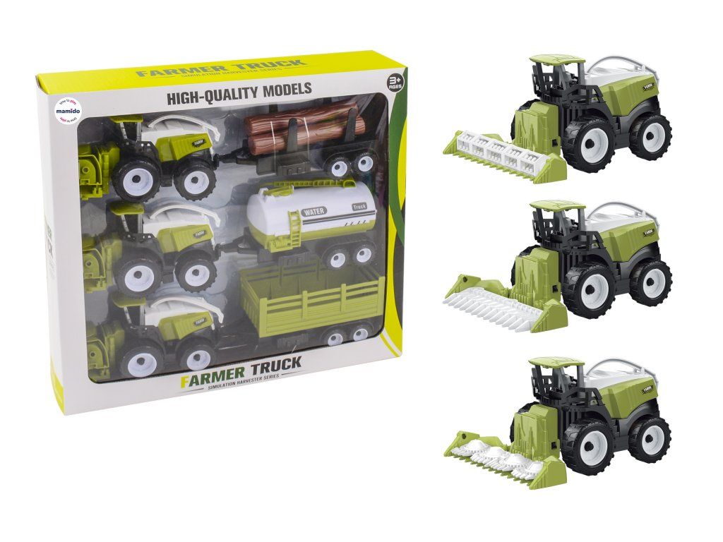 Realistická sada tří farmářských kombajnů s vleky potěší všechny malé fanoušky zemědělských strojů. Každý kombajn má vlastní žací lištu a k němu připojitelný vlek – cisternu na vodu, přívěs na dřevo a nákladní farmářský vlek. Díky detailnímu zpracování a odolnému plastovému provedení si děti mohou užít hodiny hraní na farmáře.