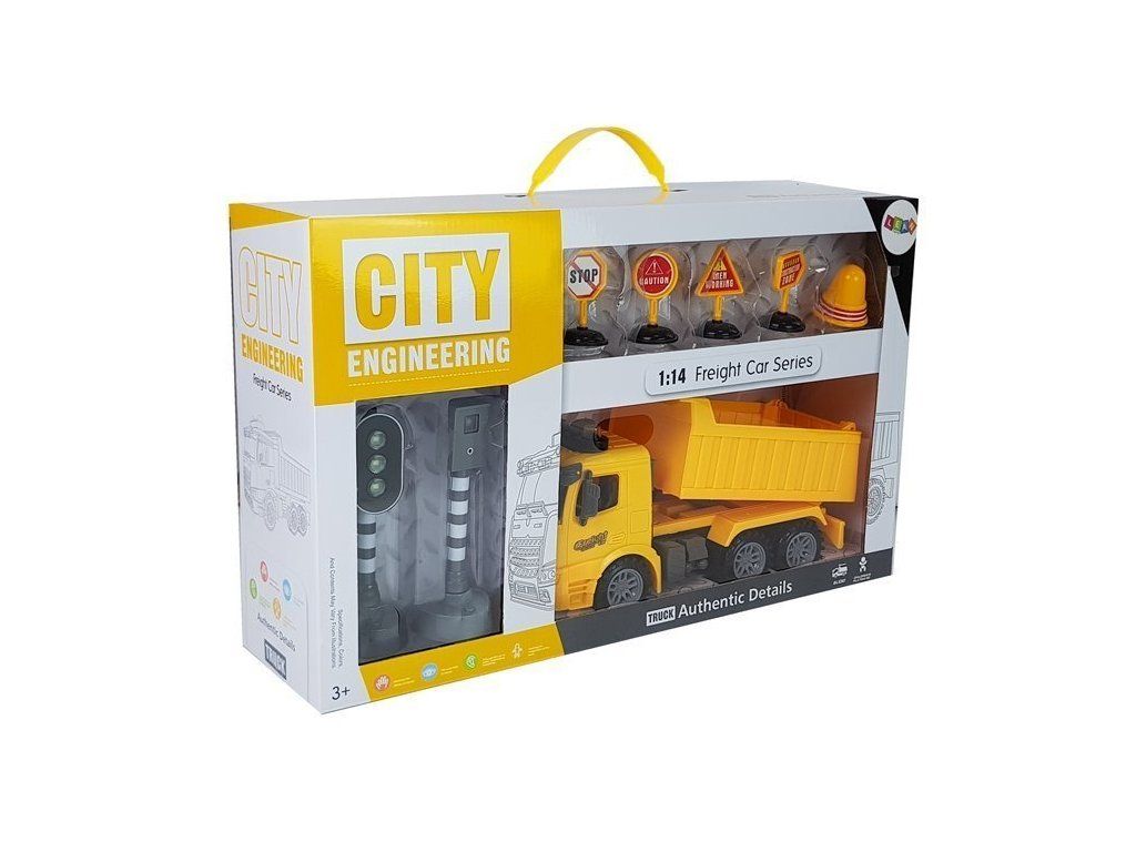Sklápěč je vozidlo, které můžete používat k pohybu po staveništi. Má světelné a zvukové efekty (startování motoru, couvání, troubení). Součástí sady jsou dopravní značky a semafory, které lze umístit na určená místa.