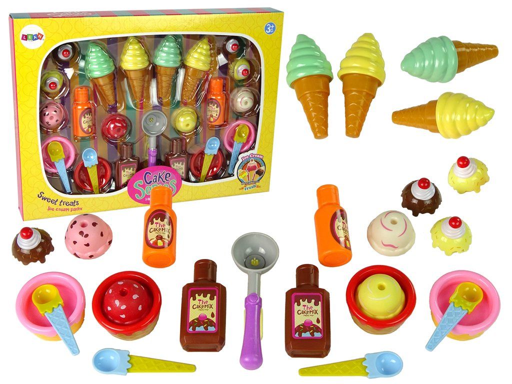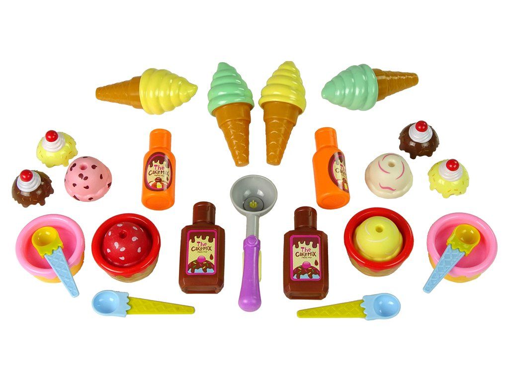 Sada sladkostí zpříjemní každé dětské odpoledne. Zmrzlinová sada se skládá z lahodně vypadajících muffinů a zmrzliny v různých barvách. Další příslušenství jako jsou lžíce, šálky nebo omáčky, pomůže vytvořit atmosféru malého prodejního stánku nebo cukrárny.