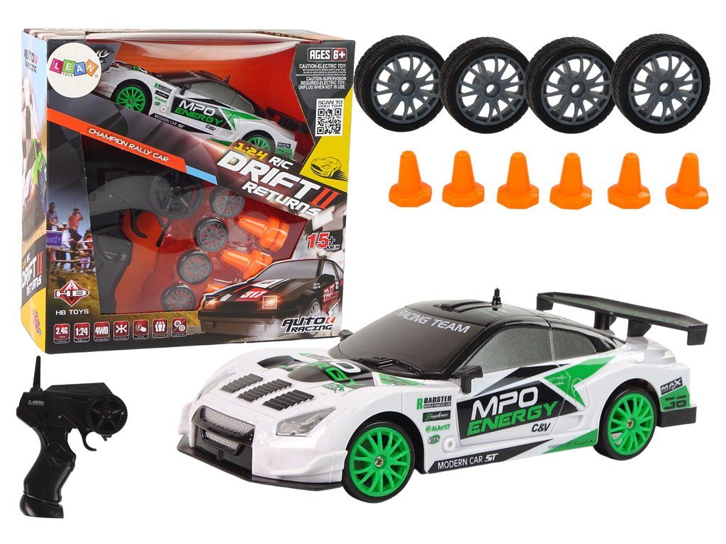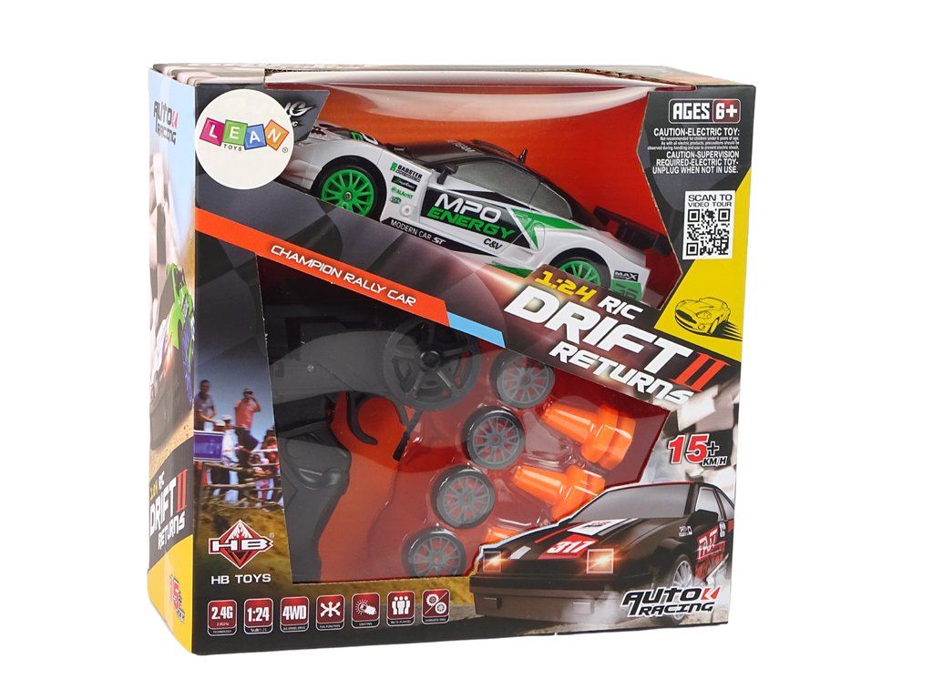 Super závodní auto na dálkové ovládání se sadou náhradních kol potěší každého fanouška automobilových závodů. Auto je vyrobeno v měřítku 1:24 a věrně napodobuje vzhled skutečných "rallye vozů". Zrychluje až na 15 km/h, což by mělo malé řidiče uspokojit. Hračka se ovládá na dálku pomocí 2,4GHz dálkového ovládání, které má zabudovanou anténu.