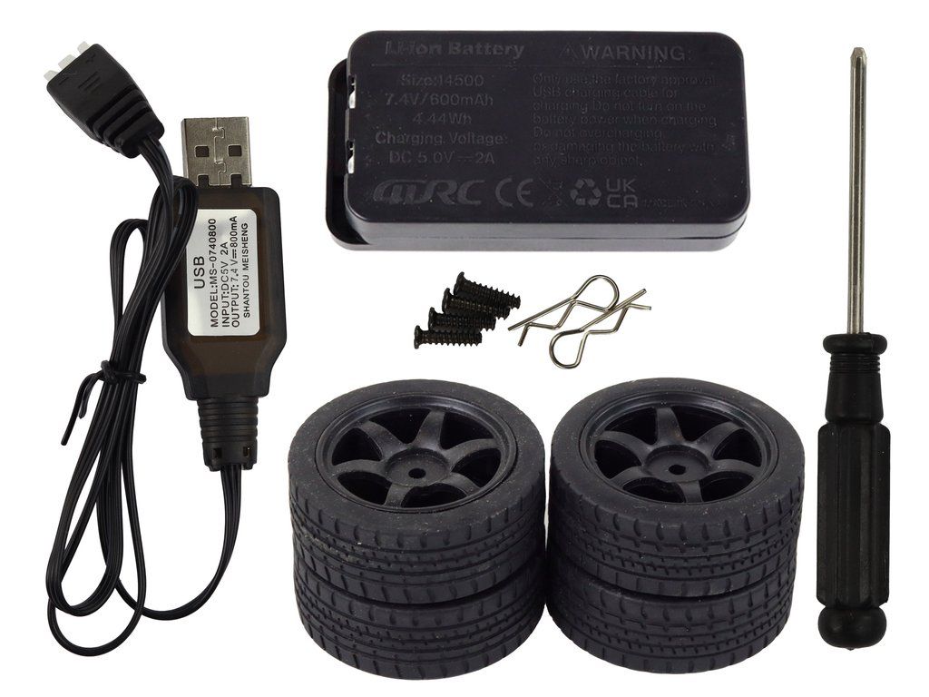 Přídavná silniční kola s gumovým vzorkem, která jsou součástí sady, umožňují přizpůsobení auta různým terénním podmínkám, což zaručuje jeho flexibilitu a přizpůsobení různým povrchům.