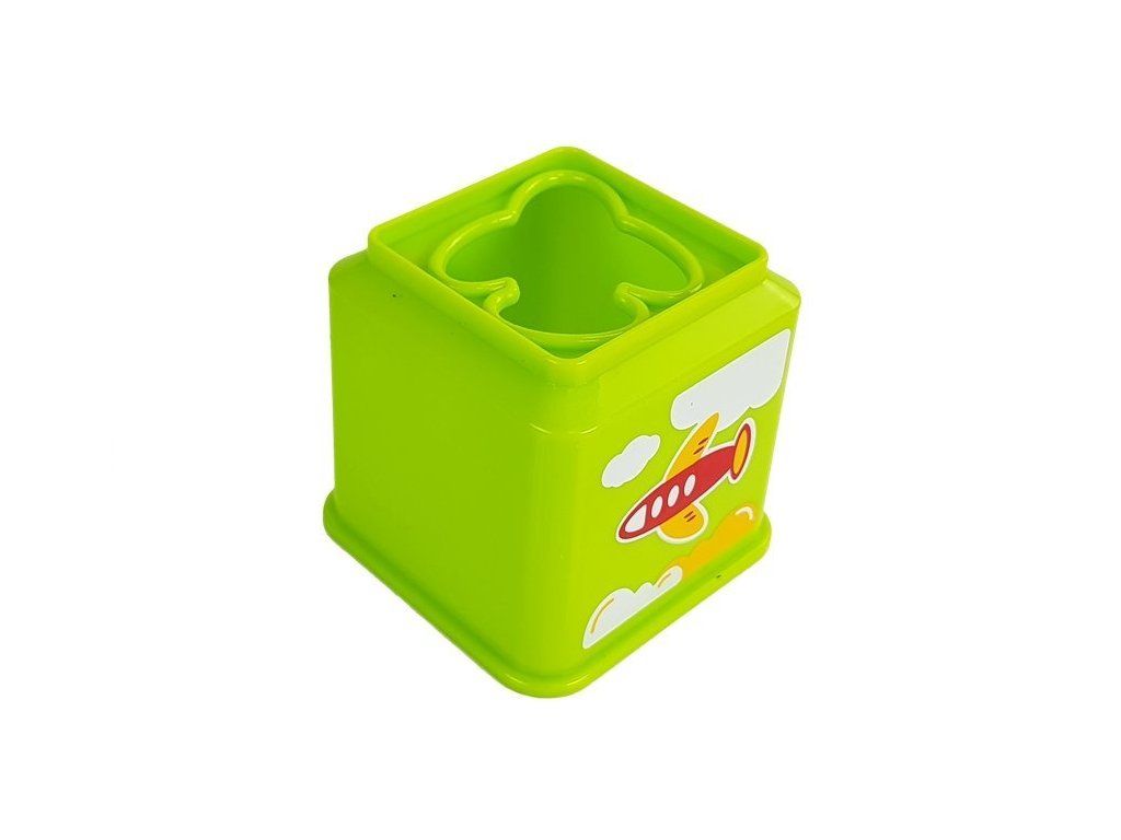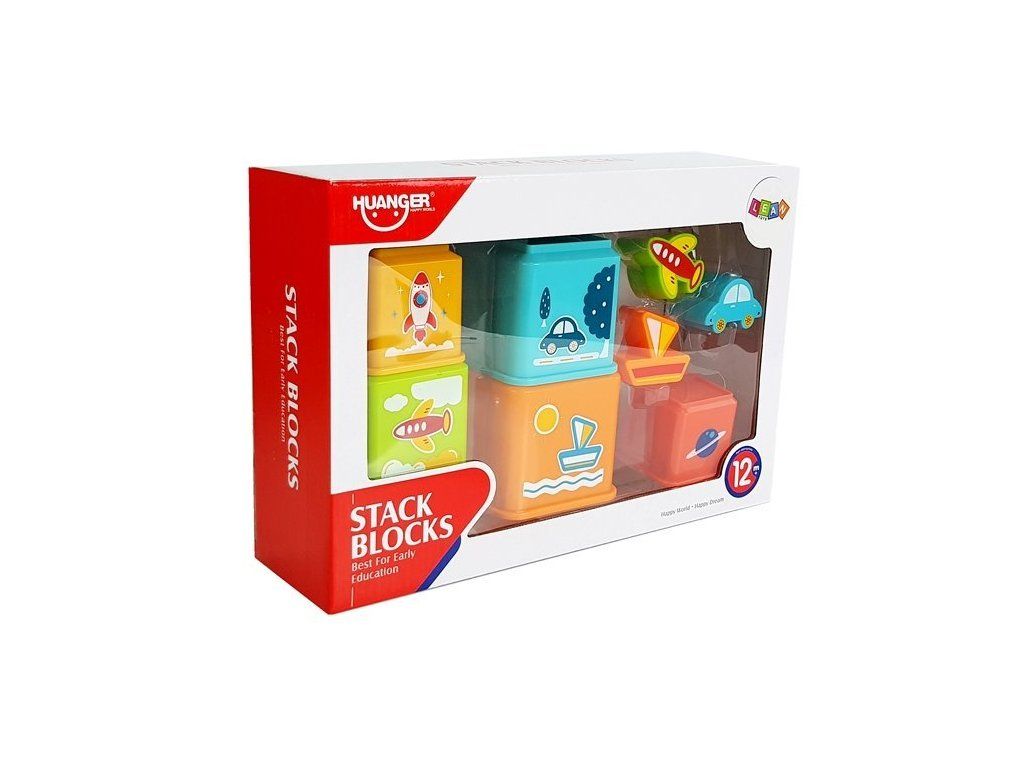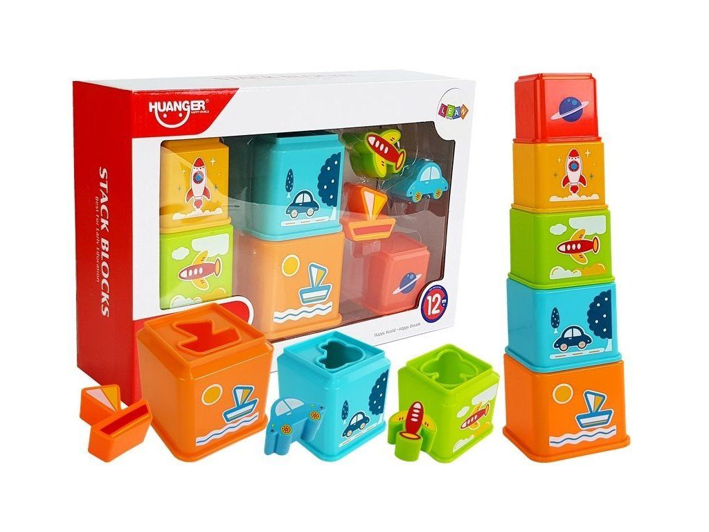 Stavebnice pyramida pro nejmenší rozvíjí logické myšlení a představivost. Do každé kostky lze vložit příslušný dopravní prostředek, jako je loď, autíčko či raketa. Hračka naučí poznávat barvy a tvary.
