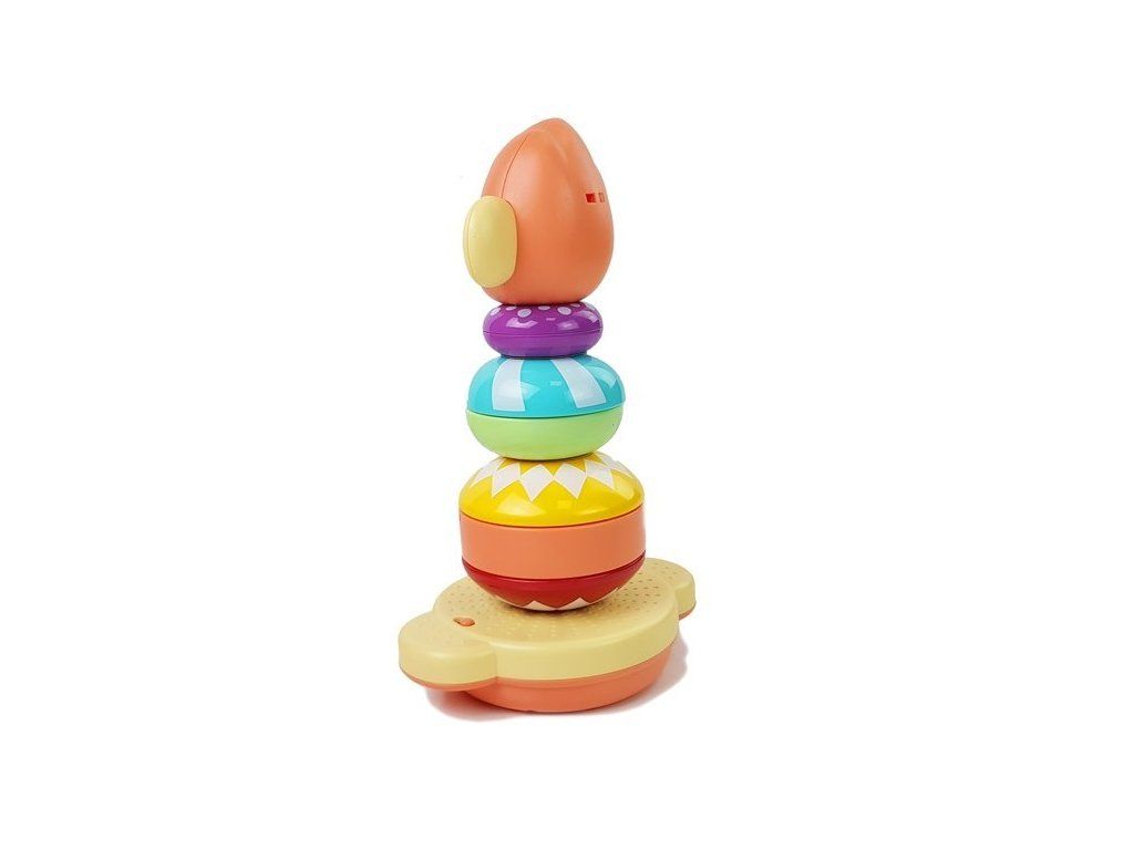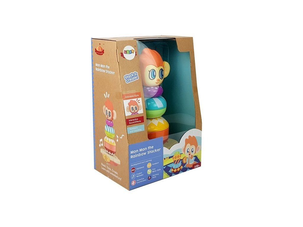 Edukační pyramida s opičkou rozvíjí motoriku a naučí děti správné tvary. Pyramida se skládá z 5 kruhů, které mají různé barvy a tvary. Po vložení každého dílu začne hračka anglicky počítat. Po složení celé pyramidy uslyšíte potlesk a radostné ohlasy.